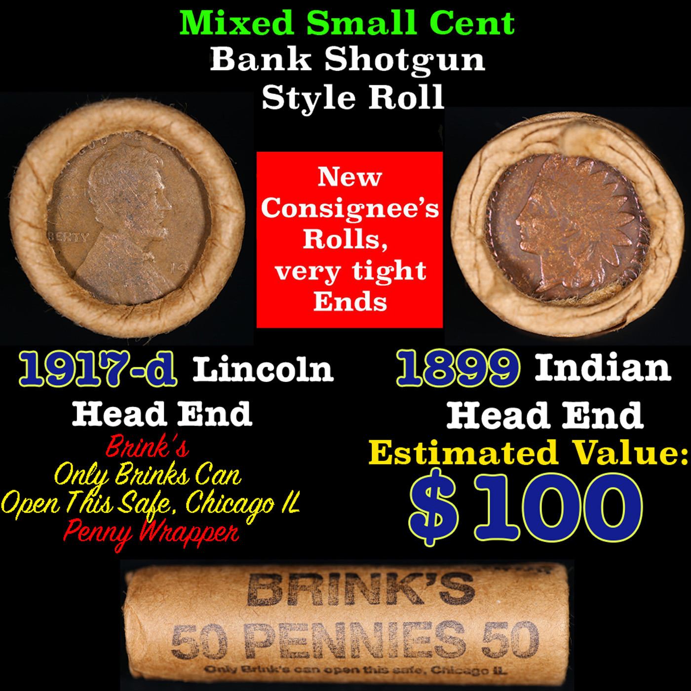 Mixed small cents 1c orig shotgun roll, 1917-d Wheat Cent, 1899 Indian Cent other end, Brinks Wrapper Grades. The roll is held in an old Rare & Collectable Brinks Wrapper. Actual roll pictured is the roll you will get. A great original bank shotgun roll with very tight ends. We have opened a few of these rolls. They seem to be mixed small cents including Indians, Wheats, Steel cents & some Flying Eagles mixed in. These shotgun rolls are all from a new consignee. They are all frrom one Estate.