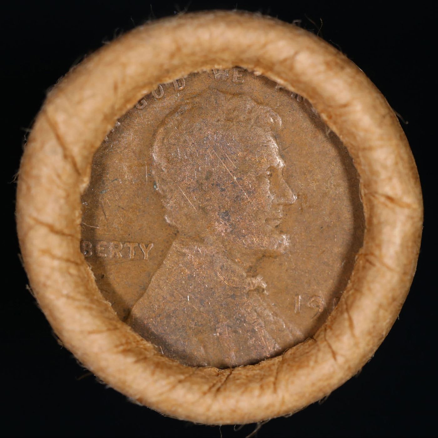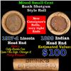 Mixed small cents 1c orig shotgun roll, 1917-d Wheat Cent, 1899 Indian Cent other end, Brinks Wrappe