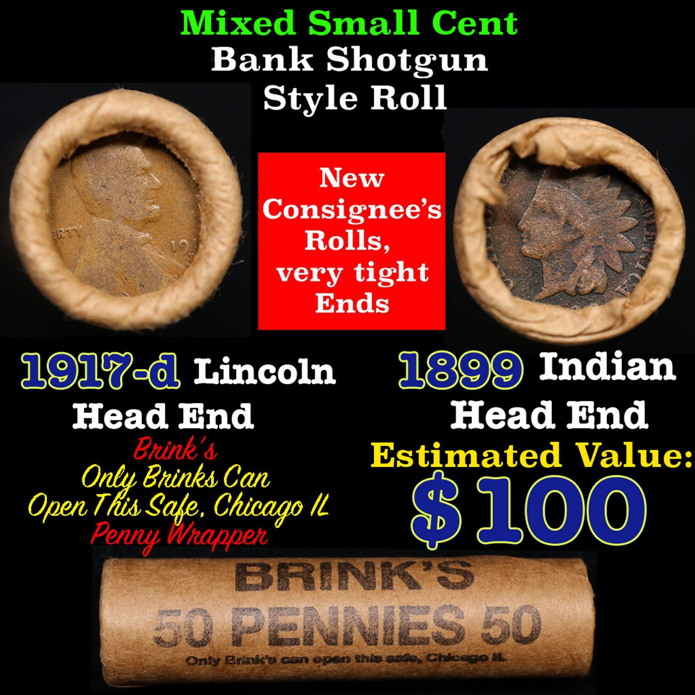 Mixed small cents 1c orig shotgun roll, 1917-d Wheat Cent, 1899 Indian Cent other end, Brinks Wrapper.. The roll is held in an old Rare & Collectable Brinks 'Only Brinks Can Open This Safe, Chicago IL' Penny wrapper. Actual roll pictured is the roll you will get. A great original bank shotgun roll with very tight ends. We have opened a few of these rolls. They seem to be mixed small cents including Indians, Wheats, Steel cents & some Flying Eagles mixed in. These shotgun rolls are all from a new consignee. They are all frrom one Estate.