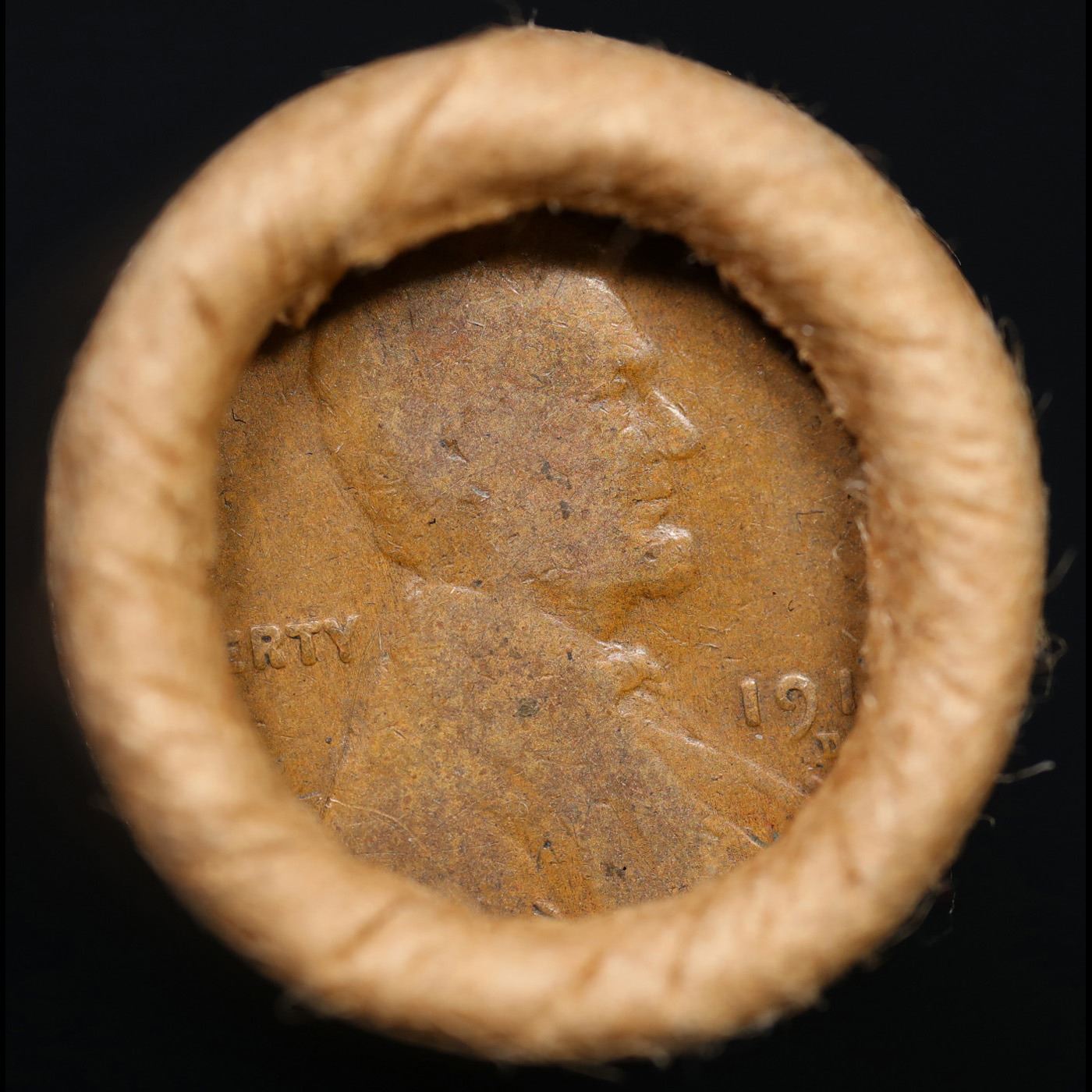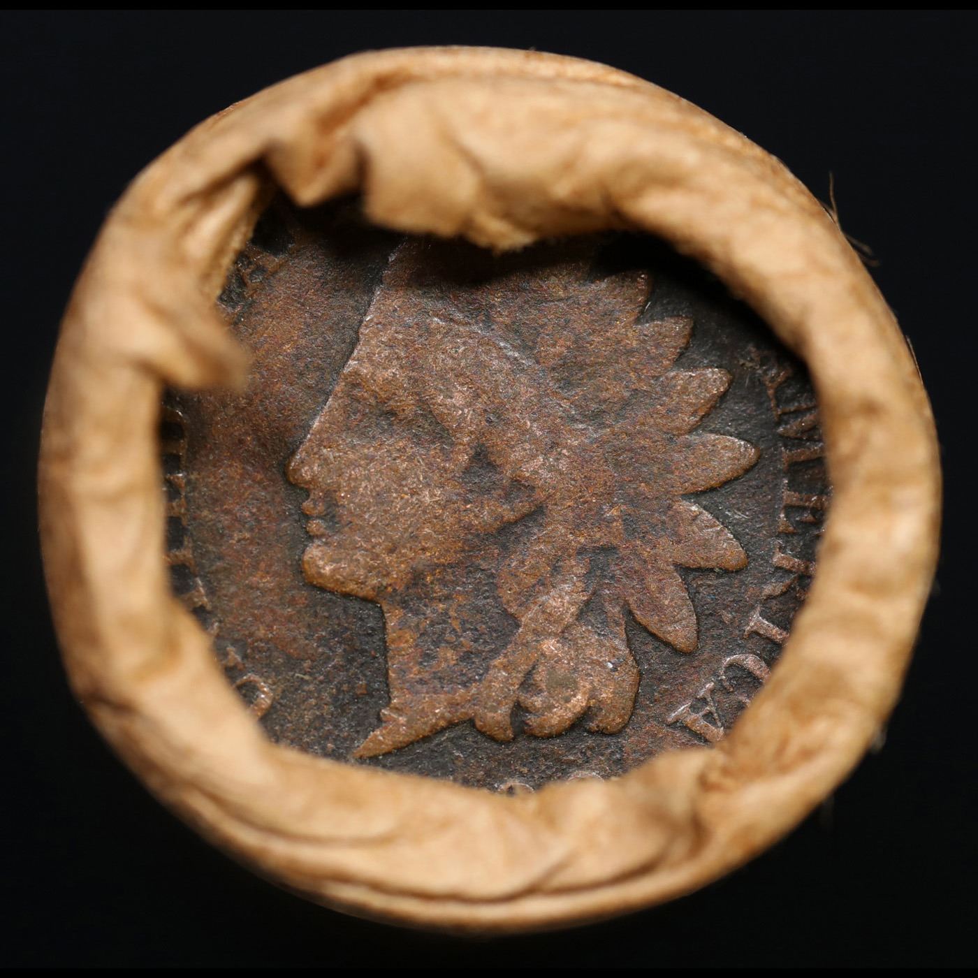 Mixed small cents 1c orig shotgun roll, 1917-d Wheat Cent, 1899 Indian Cent other end, Brinks Wrappe