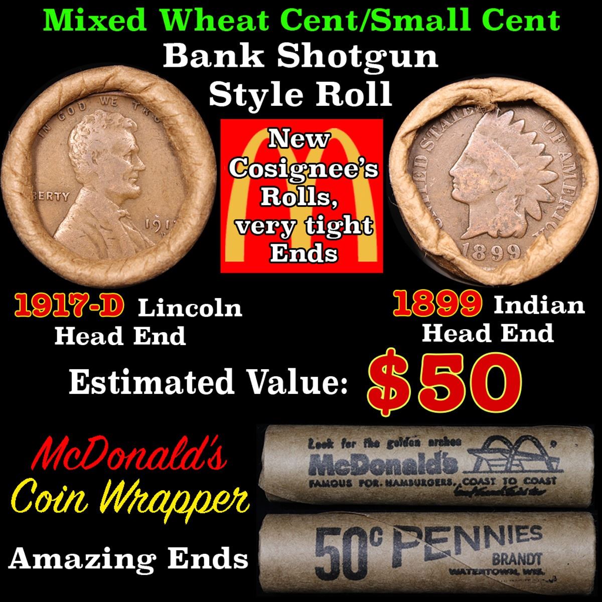 Mixed small cents 1c orig shotgun roll, 1917-d Wheat Cent, 1899 Indian Cent other end. The roll is held in an old Rare & Collectable McDonalds Brandt wrapper. Actual roll pictured is the roll you will get. A great original bank shotgun roll with very tight ends. We have opened a few of these rolls. They seem to be mixed small cents including Indians, Wheats, Steel cents & some Flying Eagles mixed in. These shotgun rolls are all from a new consignee. They are all frrom one Estate.