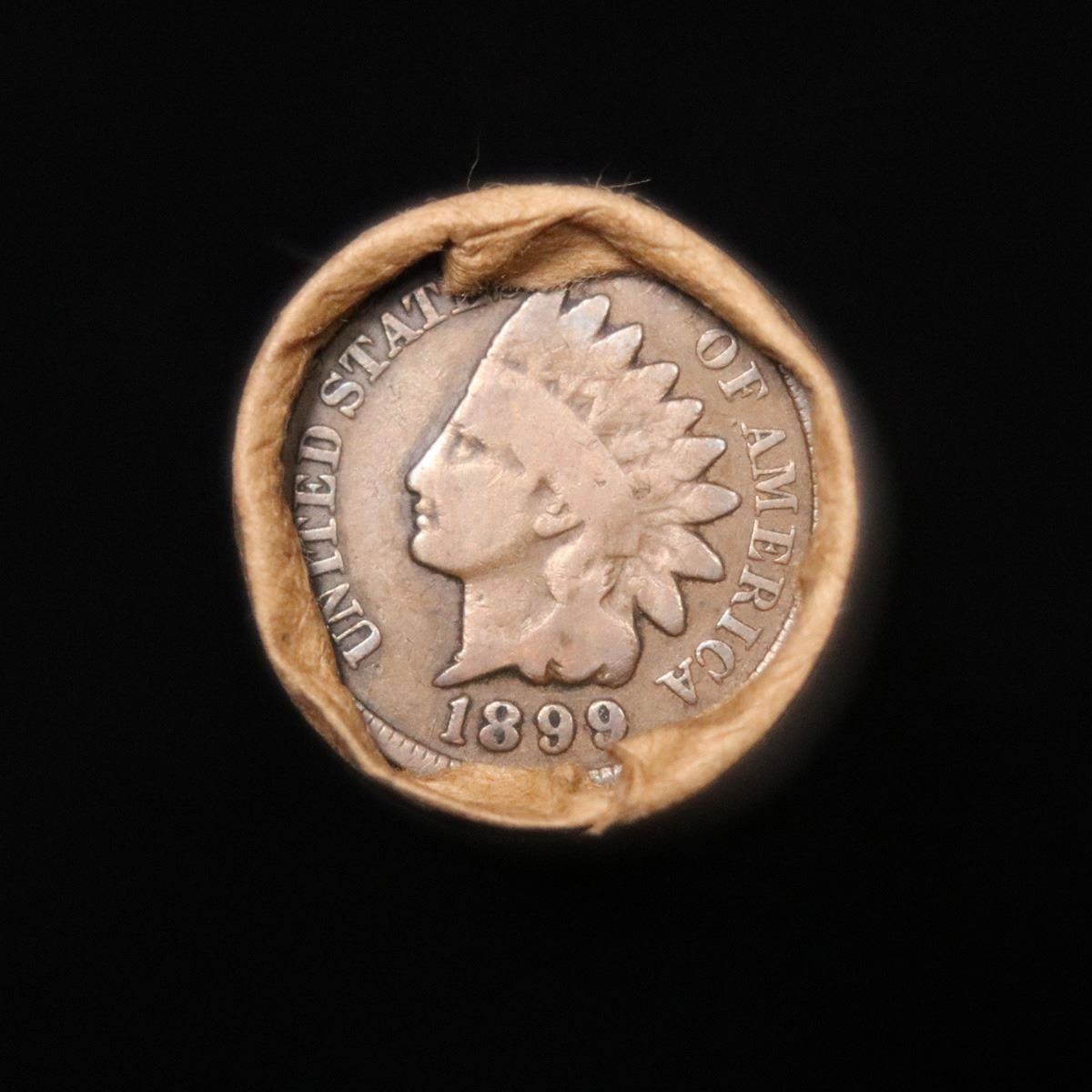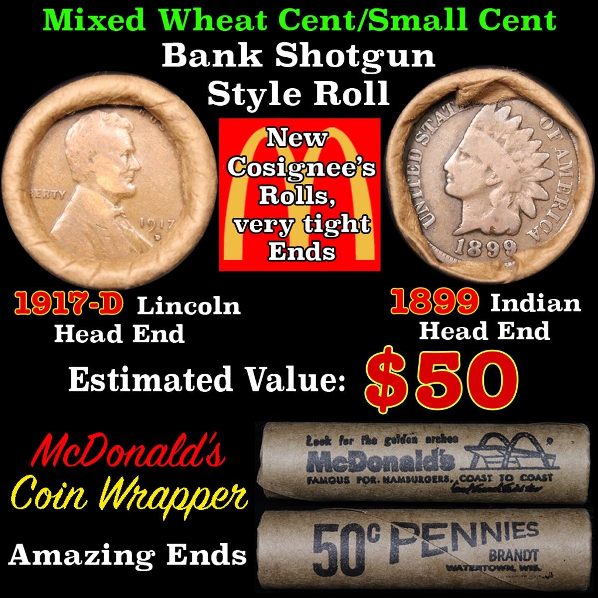 Mixed small cents 1c orig shotgun roll, 1917-d Wheat Cent, 1899 Indian Cent other end . .. The roll is held in an old Rare & Collectable McDonalds Brandt wrapper. Actual roll pictured is the roll you will get. A great original bank shotgun roll with very tight ends. We have opened a few of these rolls. They seem to be mixed small cents including Indians, Wheats, Steel cents & some Flying Eagles mixed in. These shotgun rolls are all from a new consignee. They are all frrom one Estate.