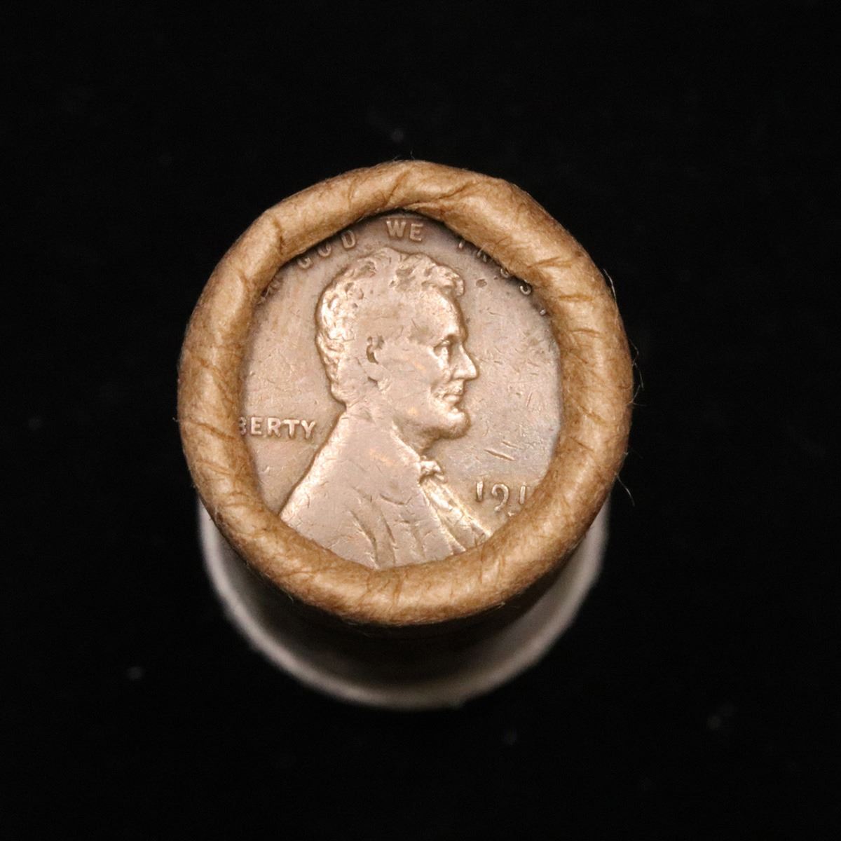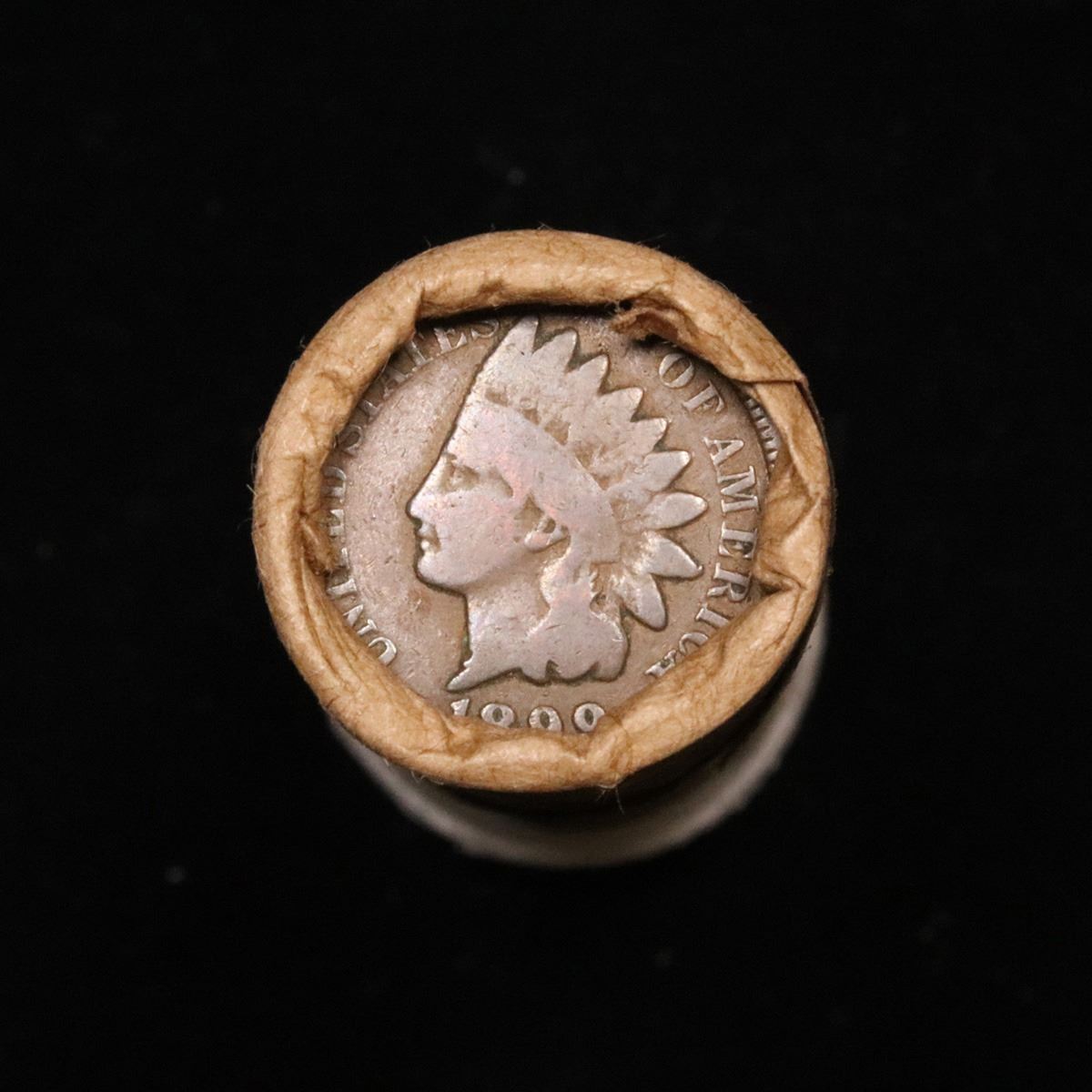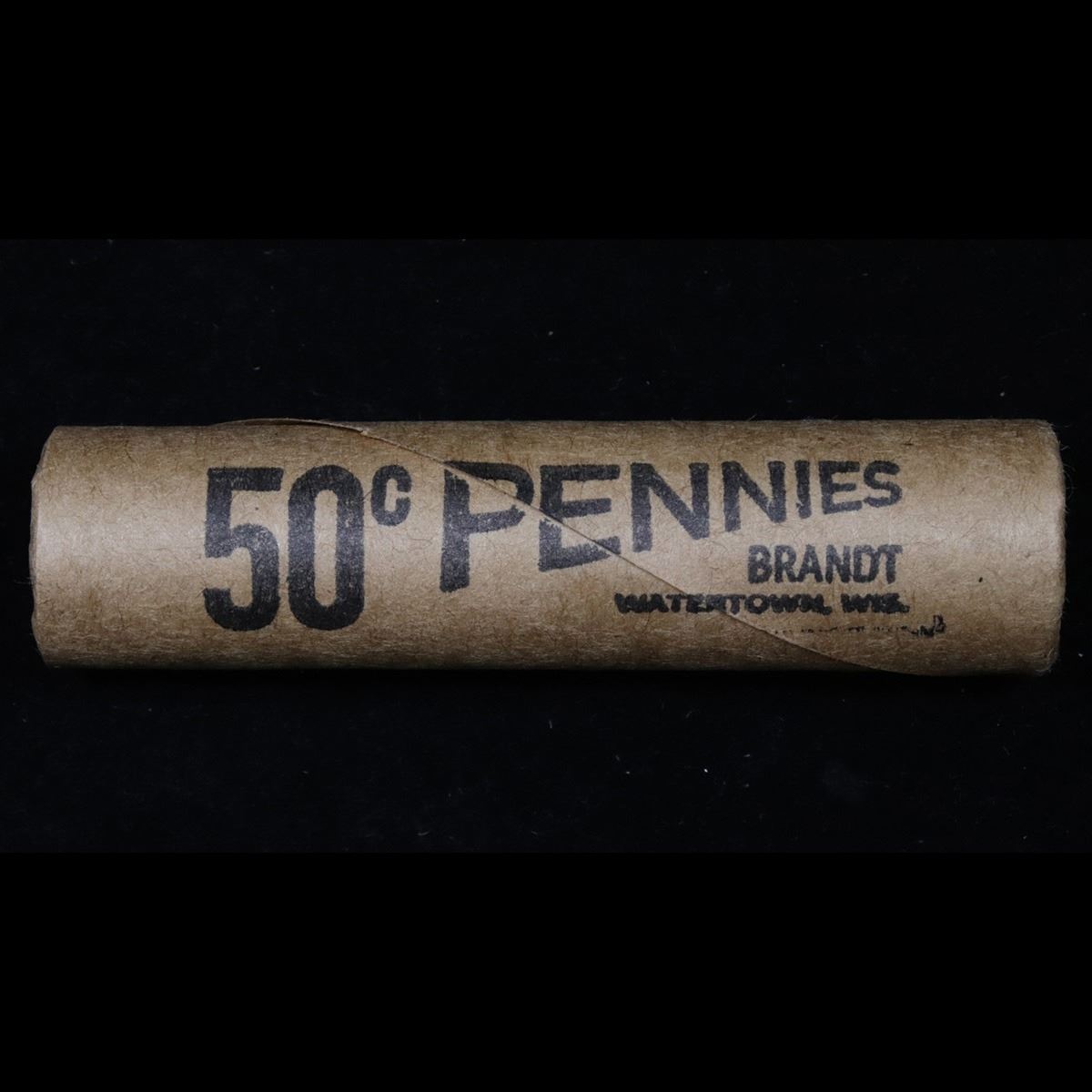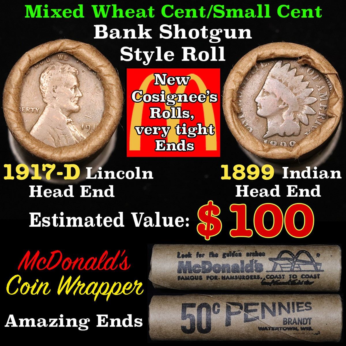 Mixed small cents 1c orig shotgun roll, 1917-d Wheat Cent, 1899 Indian Cent other end. The roll is held in an old Rare & Collectable McDonalds Brandt wrapper. Actual roll pictured is the roll you will get. A great original bank shotgun roll with very tight ends. We have opened a few of these rolls. They seem to be mixed small cents including Indians, Wheats, Steel cents & some Flying Eagles mixed in. These shotgun rolls are all from a new consignee. They are all frrom one Estate.