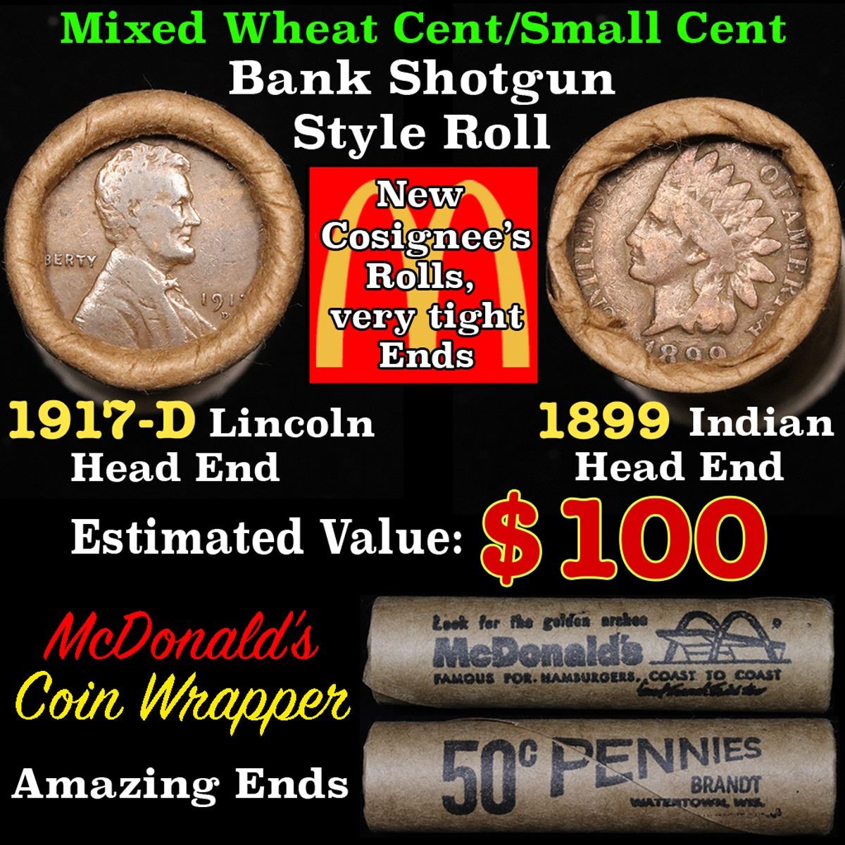 Mixed small cents 1c orig shotgun roll, 1917-d Wheat Cent, 1899 Indian Cent other end. The roll is held in an old Rare & Collectable McDonalds Brandt wrapper. Actual roll pictured is the roll you will get. A great original bank shotgun roll with very tight ends. We have opened a few of these rolls. They seem to be mixed small cents including Indians, Wheats, Steel cents & some Flying Eagles mixed in. These shotgun rolls are all from a new consignee. They are all frrom one Estate.