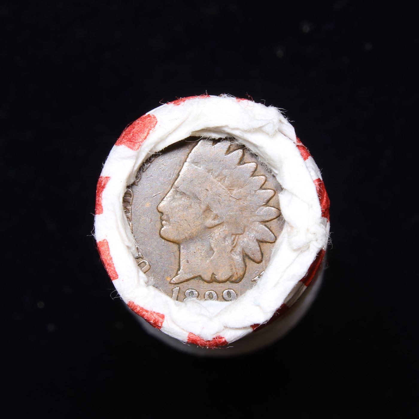 Mixed small cents 1c orig shotgun roll, 1917-d Wheat Cent, 1899 Indian cent other end, Seal Strong W