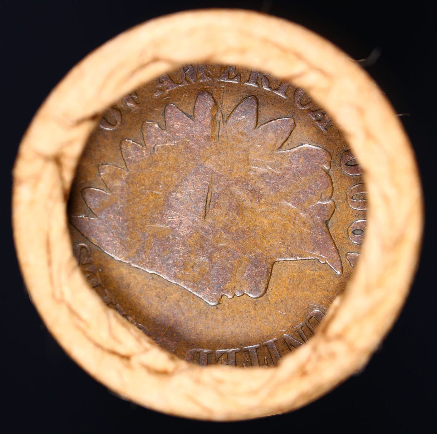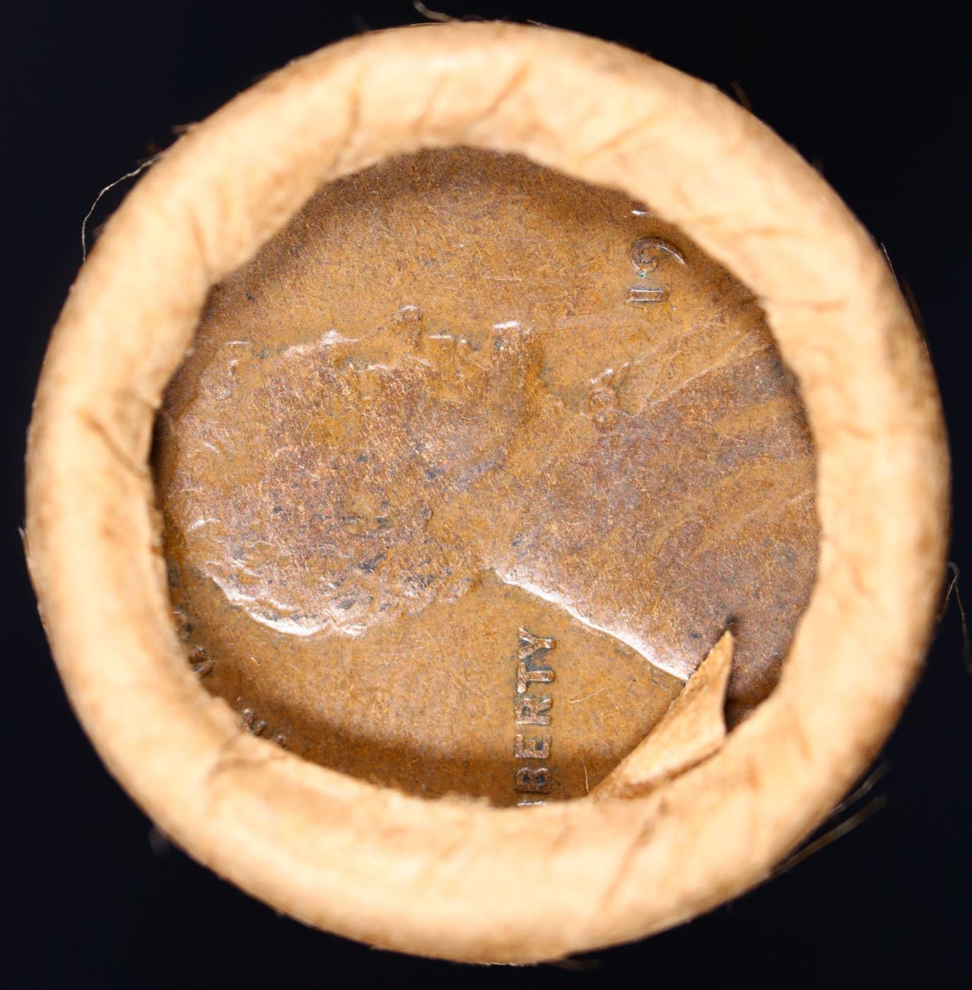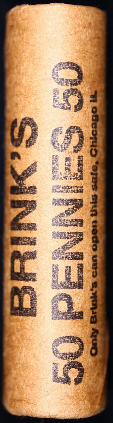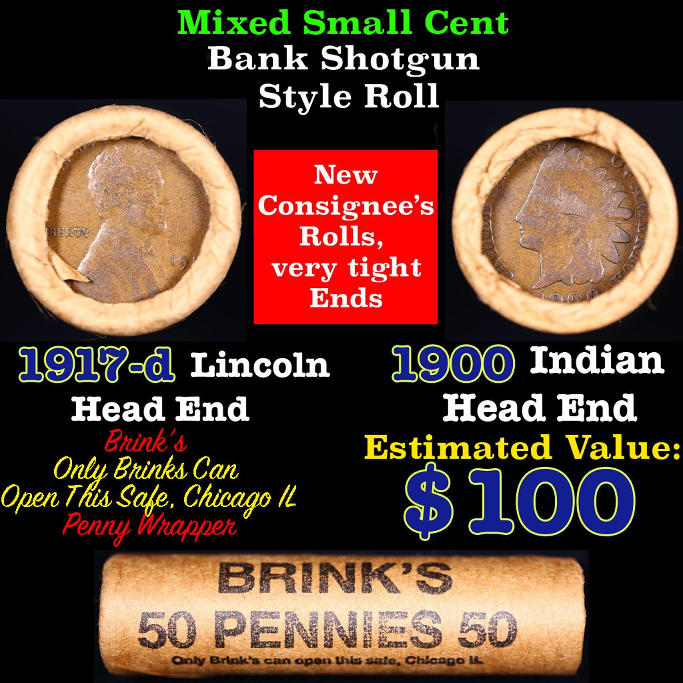 Mixed small cents 1c orig shotgun roll, 1917-d Wheat Cent, 1900 Indian Cent other end, Brinks Wrapper Roll