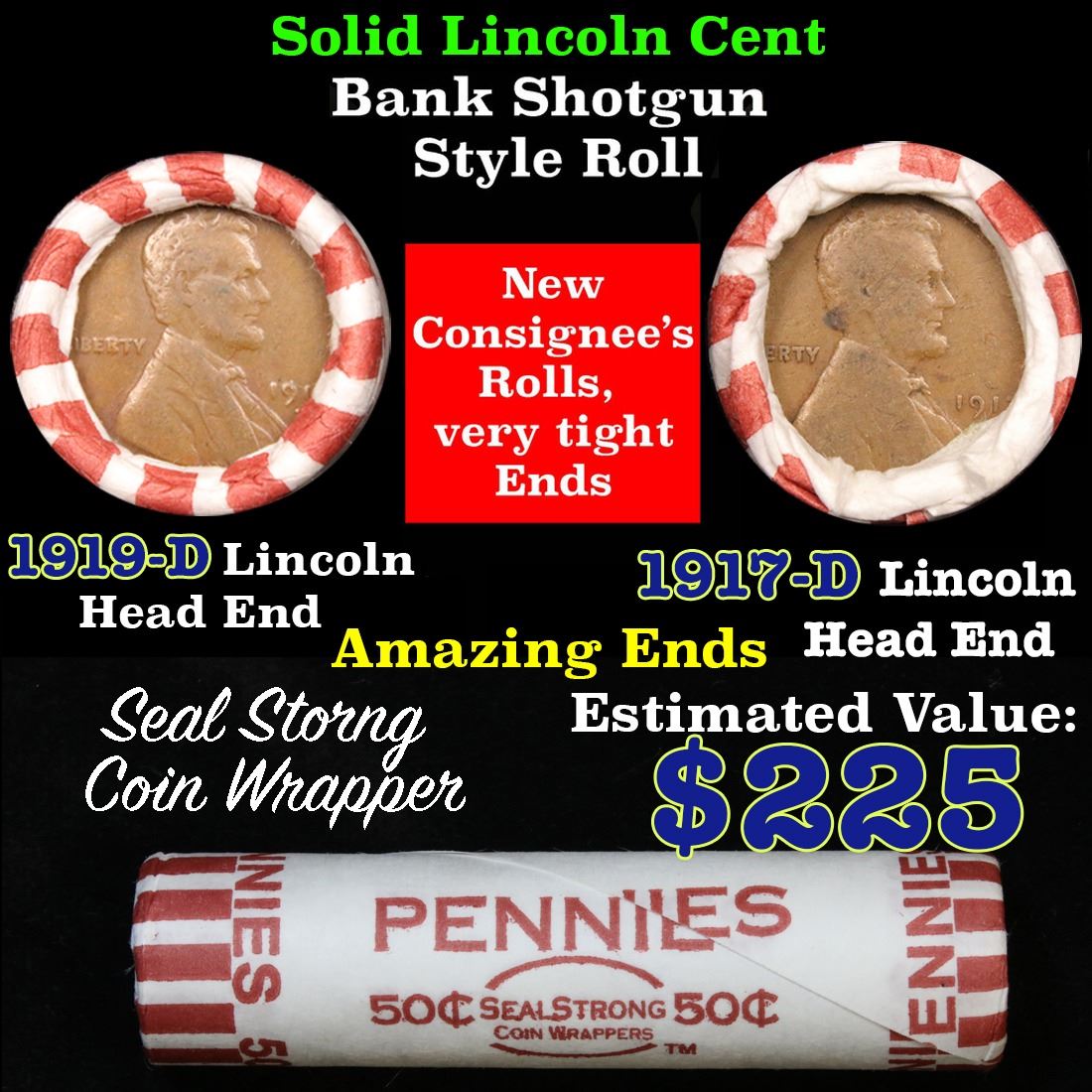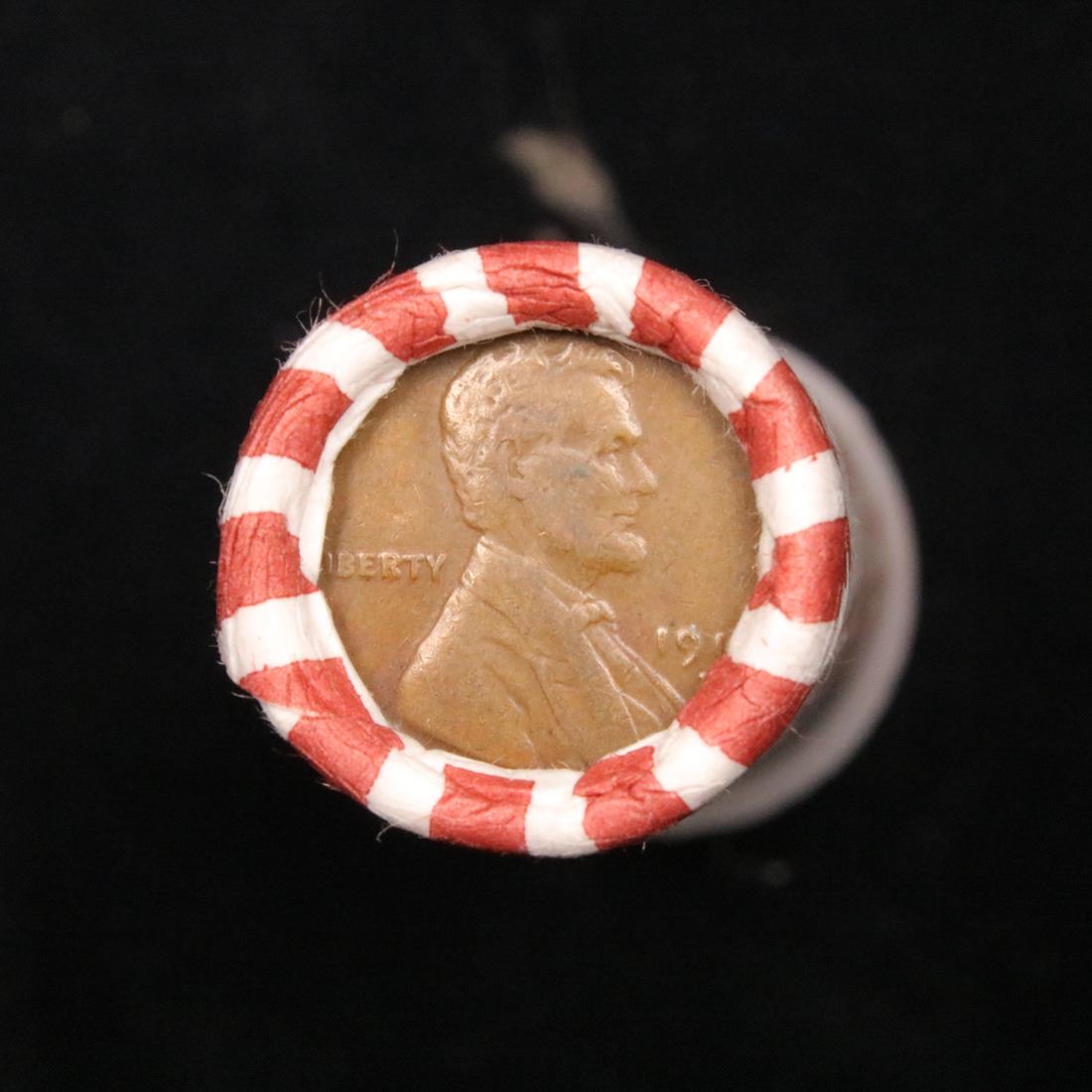 Mixed small cents 1c orig shotgun roll, 1917-d Wheat Cent, 1919-d Wheat Cent other end. The roll is held in an old Seal Strong wrapper. Actual roll pictured is the roll you will get. A great original bank shotgun roll with very tight ends. We have been getting excellent feedback on these rolls. Were being told that close to half the roll are teens, some with mintmarks, there are a few Indians in all the rolls, most of the rolls have steel cents. They seem to be PQ Wheaties rolls. These shotgun rolls are all from a new consignee. They are all frrom one Estate.