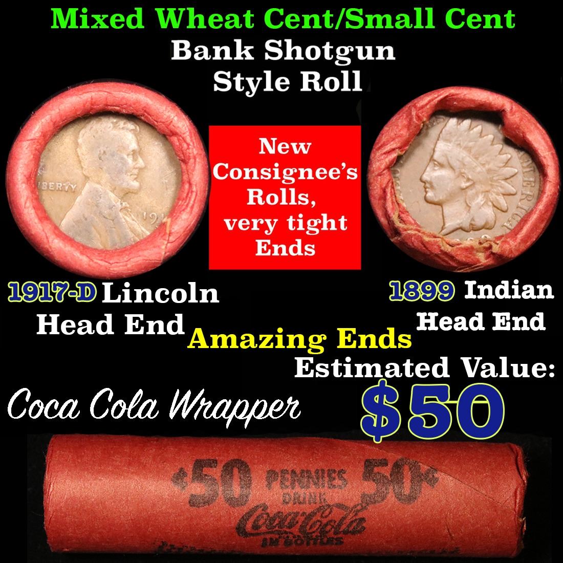 Mixed small cents 1c orig shotgun roll, 1917-d one end, 1899 Indian cent other end. The roll is held in an old, rare and collectible Coca-Cola wrapper. Actual roll pictured is the roll you will get. A great original bank shotgun roll with very tight ends. We have been getting excellent feedback on these rolls. Were being told that close to half the roll are teens, some with mintmarks, there are a few Indians in all the rolls, most of the rolls have steel cents. They seem to be PQ Wheaties rolls. These shotgun rolls are all from a new consignee. They are all frrom one Estate. This particular Roll shows a 1917-d on one end and an 1899 Indian on the other end.