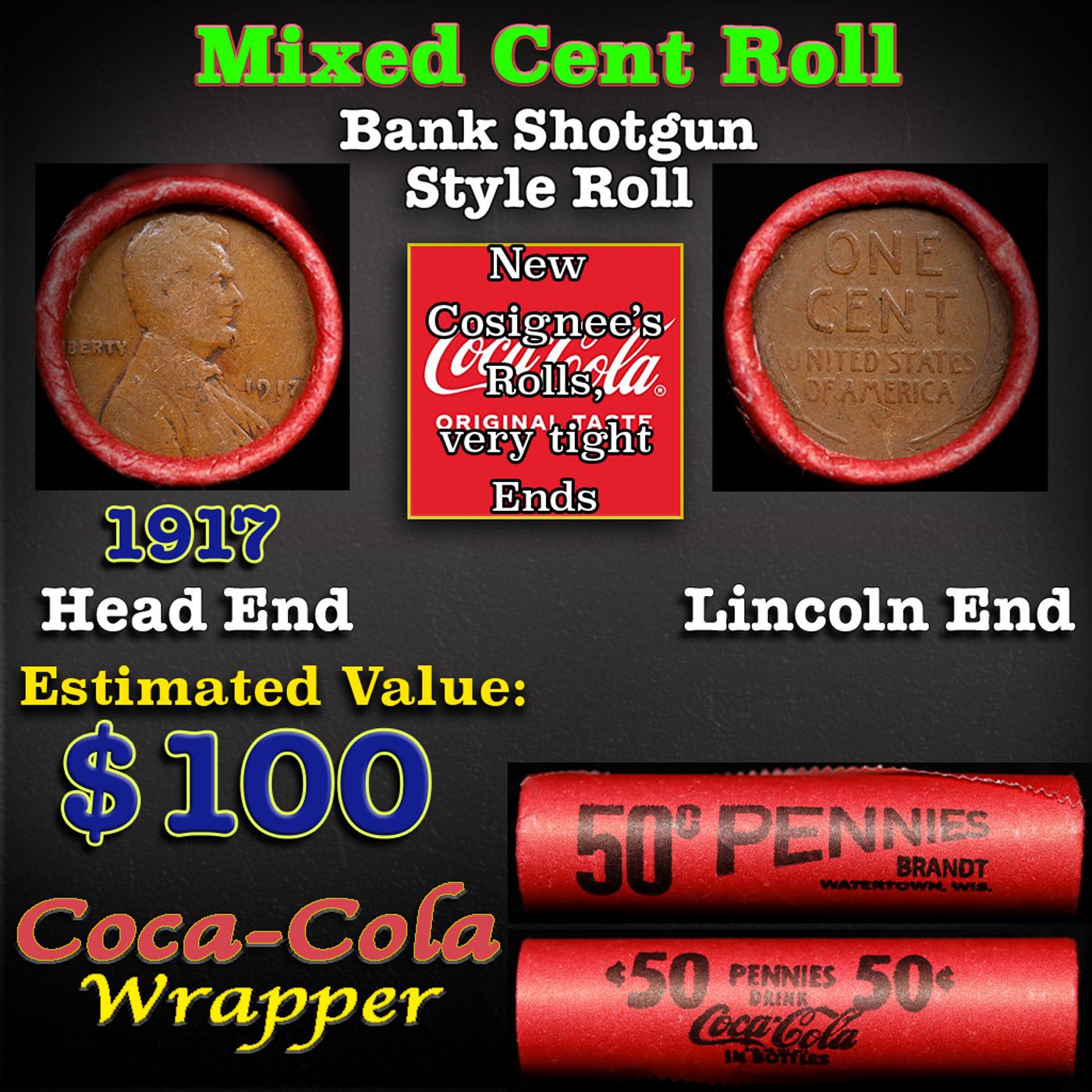 Mixed small cents 1c orig shotgun roll, 1917-p Lincoln Cent, Wheat Cent other end, Coca-Cola Brandt Wrapper.. The roll is held in an old Rare & Collectable Brinks 'Only Brinks Can Open This Safe, Chicago IL' Penny wrapper. Actual roll pictured is the roll you will get. A great original bank shotgun roll with very tight ends. We have opened a few of these rolls. They seem to be mixed small cents including Indians, Wheats, Steel cents & some Flying Eagles mixed in. These shotgun rolls are all from a new consignee. They are all frrom one Estate.