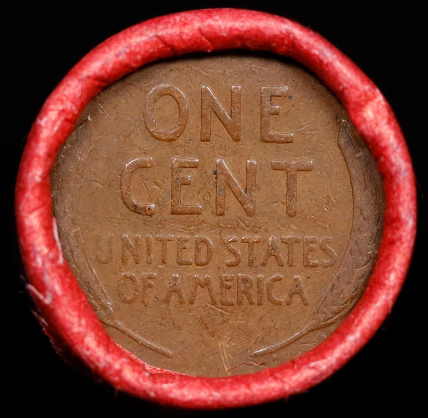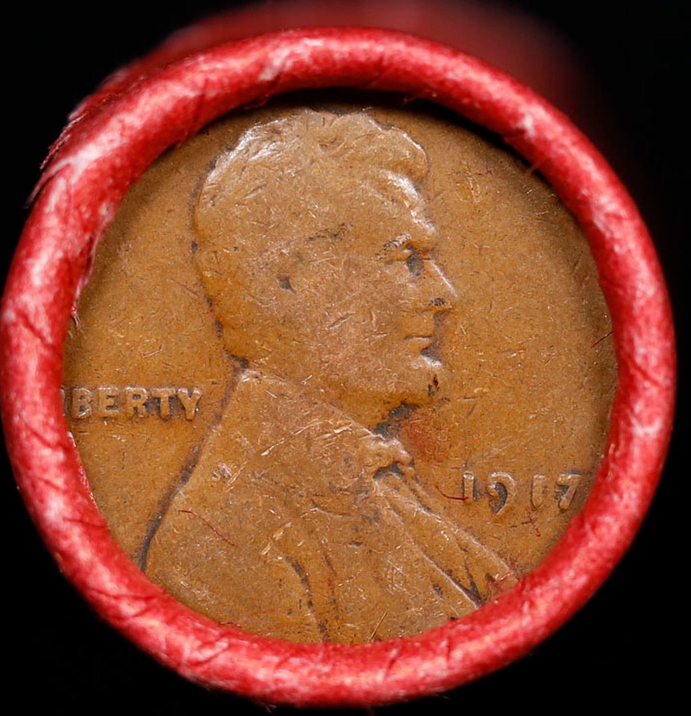 Mixed small cents 1c orig shotgun roll, 1917-p Lincoln Cent, Wheat Cent other end, Coca-Cola Brandt