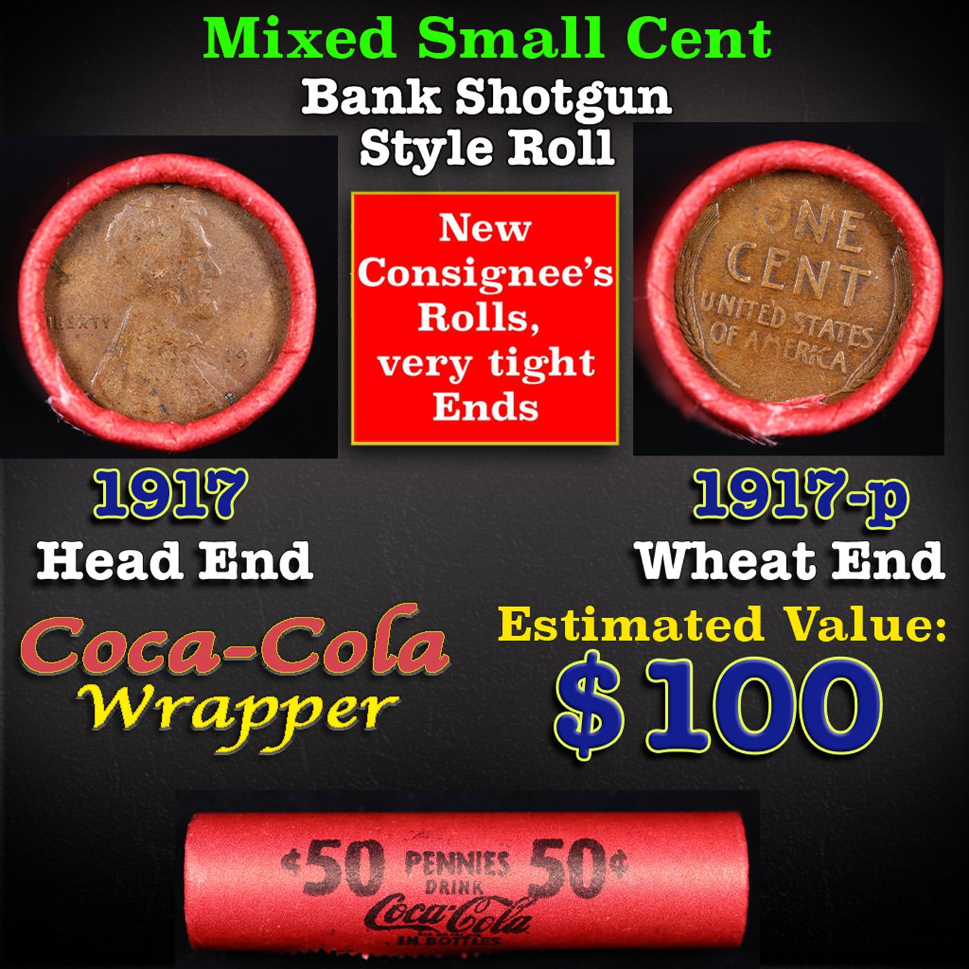 Mixed small cents 1c orig shotgun roll, 1917-p Lincoln Cent, Wheat Cent other end, Coca Cola Wrapper. Actual roll pictured is the roll you will get. A Brandt wrapper stamped Coca-Cola. A great original bank shotgun roll with very tight ends. We have opened a few of these rolls. They seem to be mixed small cents including Indians, Wheats, Steel cents & some Flying Eagles mixed in. These shotgun rolls are all from a new consignee. They are all frrom one Estate.