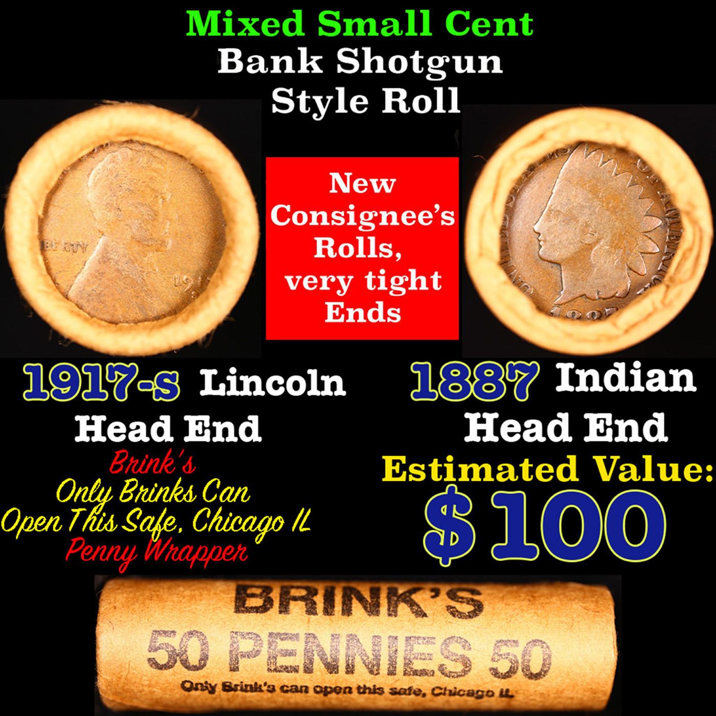 Mixed small cents 1c orig shotgun roll, 1917-s Wheat Cent, 1887 Indian Cent other end, brinks Wrapper. The roll is held in an old Rare & Collectable Brinks 'Only Brinks Can Open This Safe, Chicago IL' Penny wrapper. Actual roll pictured is the roll you will get. A great original bank shotgun roll with very tight ends. We have opened a few of these rolls. They seem to be mixed small cents including Indians, Wheats, Steel cents & some Flying Eagles mixed in. These shotgun rolls are all from a new consignee. They are all frrom one Estate.