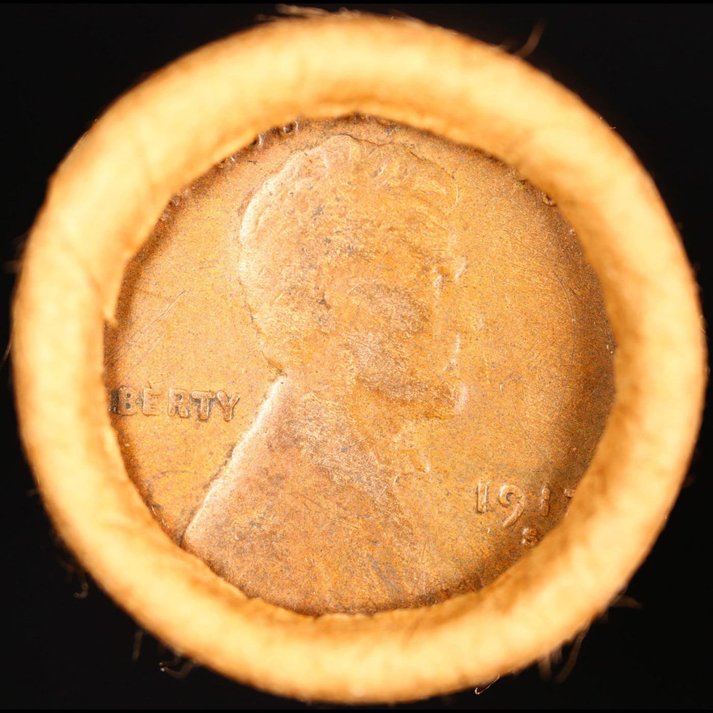 Mixed small cents 1c orig shotgun roll, 1917-s Wheat Cent, 1887 Indian Cent other end, brinks Wrappe