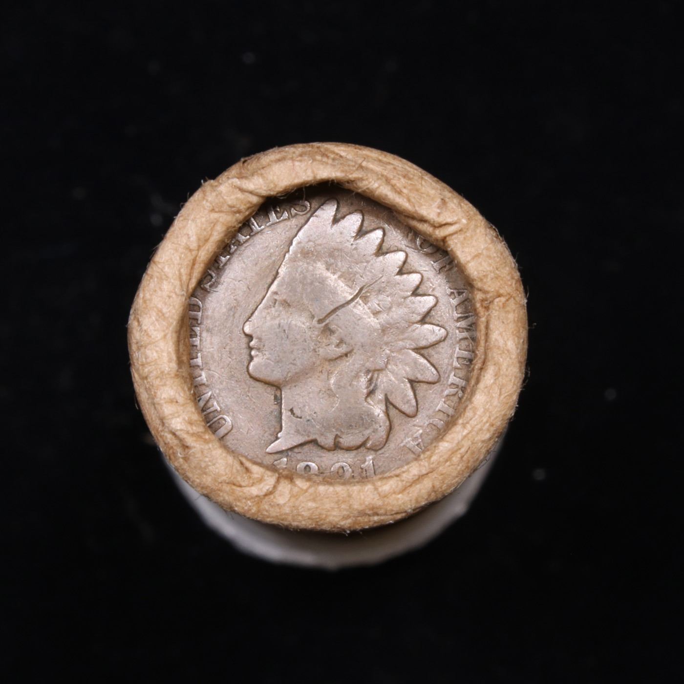 Mixed small cents 1c orig shotgun roll, 1917-s Wheat Cent, 1891 Indian Cent other end,McDnalds Wrapp