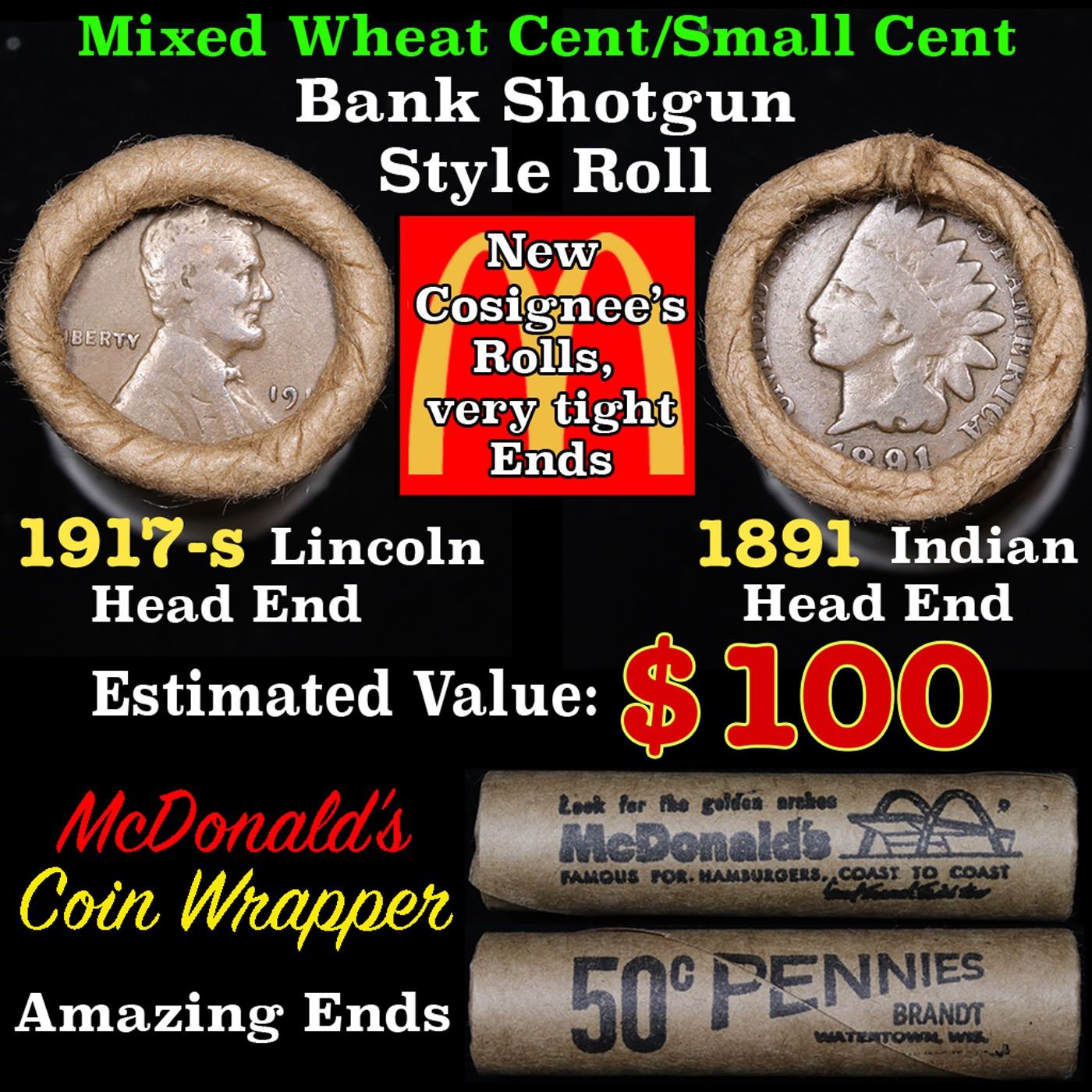 Mixed small cents 1c orig shotgun roll, 1917-s Wheat Cent, 1891 Indian Cent other end, McDonalds Wrapper Grades. The roll is held in an old Rare & Collectable McDonalds Brandt wrapper. Look For The Golden Arches. Actual roll pictured is the roll you will get. A great original bank shotgun roll with very tight ends. We have opened a few of these rolls. They seem to be mixed small cents including Indians, Wheats, Steel cents & some Flying Eagles mixed in. These shotgun rolls are all from a new consignee. They are all frrom one Estate.