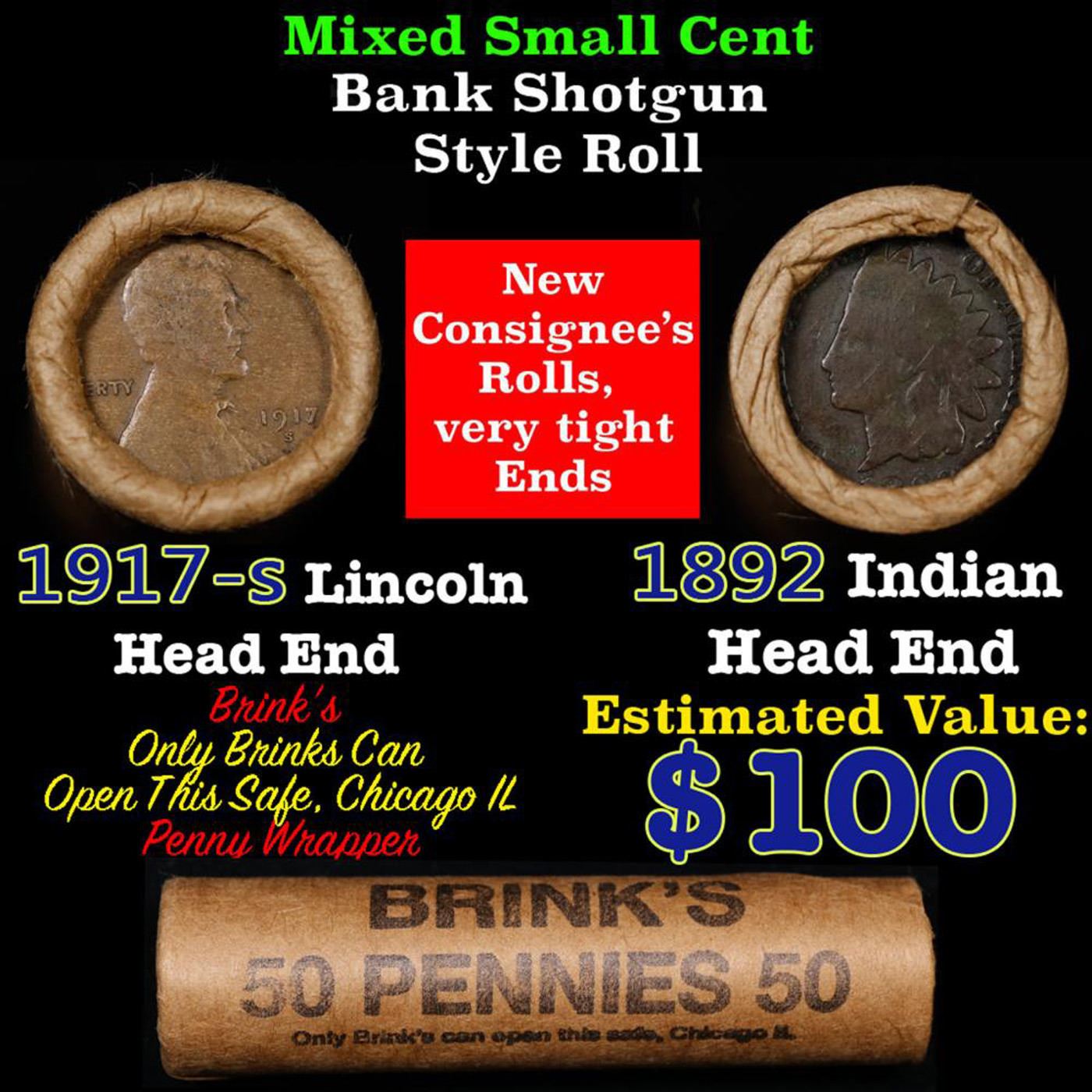 Mixed small cents 1c orig shotgun roll, 1917-s Wheat Cent, 1892 Indian Cent other end, Brinks Wrapper.. The roll is held in an old Rare & Collectable Brinks 'Only Brinks Can Open This Safe, Chicago IL' Penny wrapper. Actual roll pictured is the roll you will get. A great original bank shotgun roll with very tight ends. We have opened a few of these rolls. They seem to be mixed small cents including Indians, Wheats, Steel cents & some Flying Eagles mixed in. These shotgun rolls are all from a new consignee. They are all frrom one Estate.