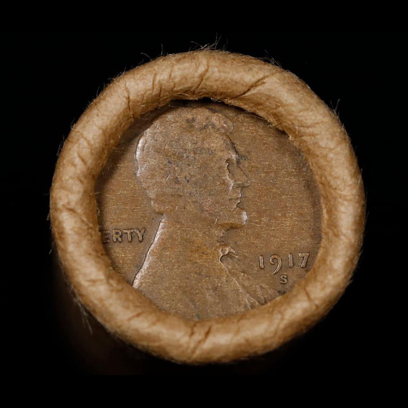 Mixed small cents 1c orig shotgun roll, 1917-s Wheat Cent, 1892 Indian Cent other end, Brinks Wrappe