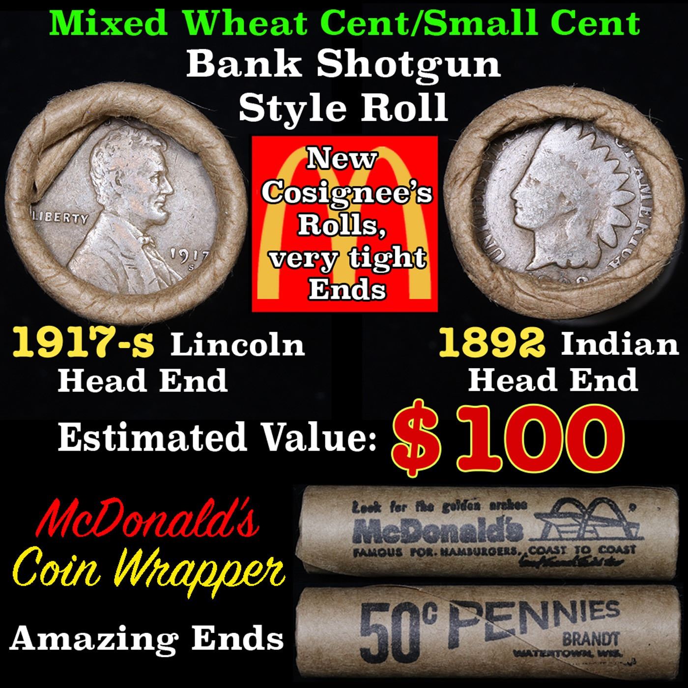 Mixed small cents 1c orig shotgun roll, 1917-s Wheat Cent, 1892 Indian Cent other end, McDnalds Wrapper Grades. The roll is held in an old Rare & Collectable McDonalds Brandt wrapper. Look For The Golden Arches. Actual roll pictured is the roll you will get. A great original bank shotgun roll with very tight ends. We have opened a few of these rolls. They seem to be mixed small cents including Indians, Wheats, Steel cents & some Flying Eagles mixed in. These shotgun rolls are all from a new consignee. They are all frrom one Estate.