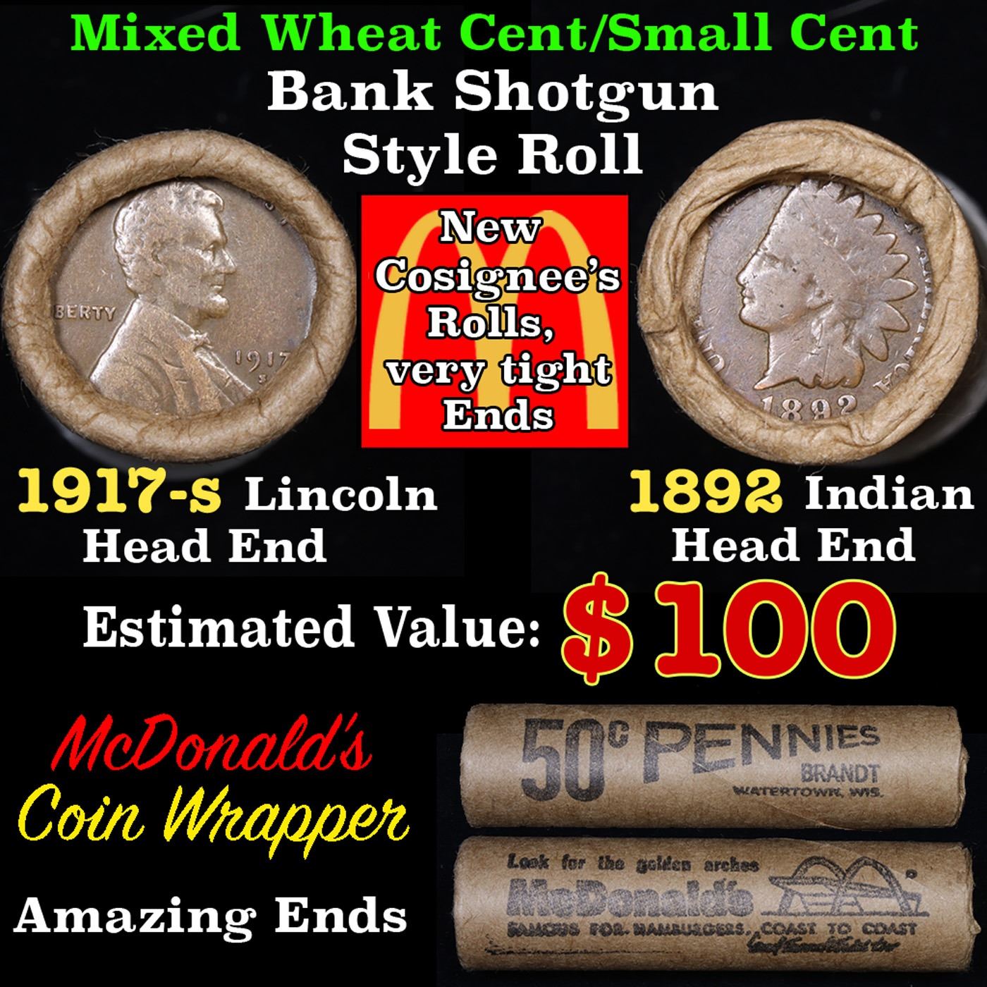 Mixed small cents 1c orig shotgun roll, 1917-s Wheat Cent, 1892 Indian Cent other end, McDonalds Wrapper Grades. The roll is held in an old Rare & Collectable McDonalds Brandt wrapper. Look For The Golden Arches. Actual roll pictured is the roll you will get. A great original bank shotgun roll with very tight ends. We have opened a few of these rolls. They seem to be mixed small cents including Indians, Wheats, Steel cents & some Flying Eagles mixed in. These shotgun rolls are all from a new consignee. They are all frrom one Estate.
