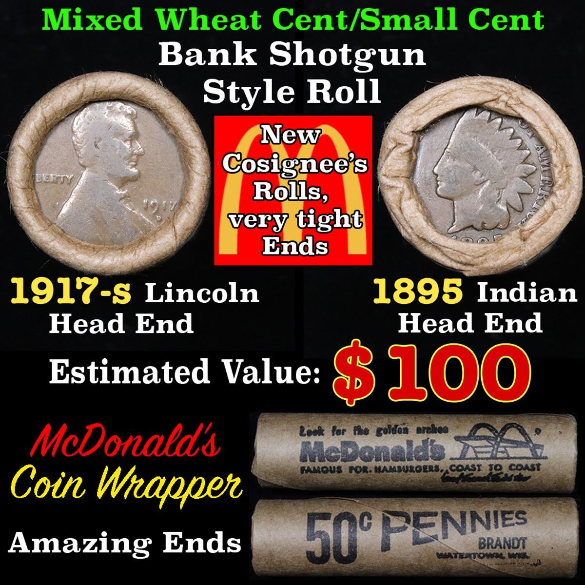 Mixed small cents 1c orig shotgun roll, 1917-s Wheat Cent, 1895 Indian Cent other end. The roll is held in an old Rare & Collectable McDonalds Brandt wrapper. Actual roll pictured is the roll you will get. A great original bank shotgun roll with very tight ends. We have opened a few of these rolls. They seem to be mixed small cents including Indians, Wheats, Steel cents & some Flying Eagles mixed in. These shotgun rolls are all from a new consignee. They are all frrom one Estate.