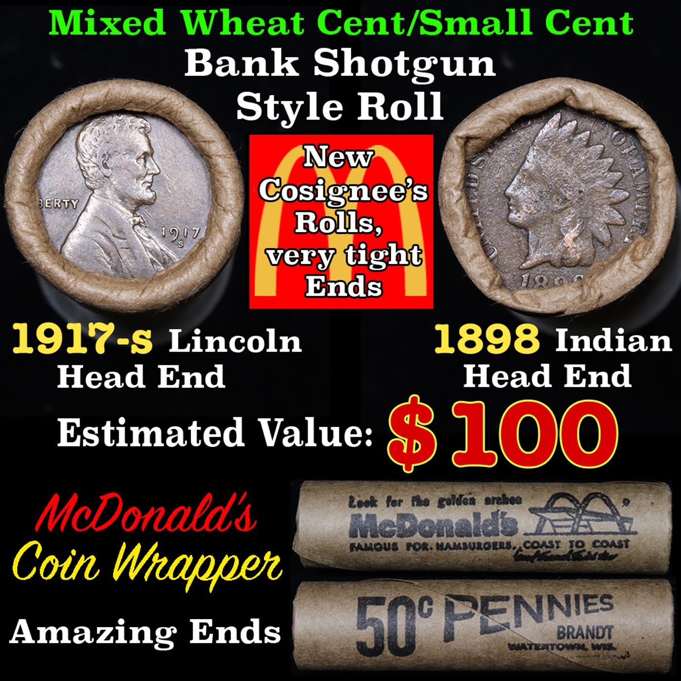 Mixed small cents 1c orig shotgun roll, 1917-s Wheat Cent, 1898 Indian Cent other end, McDnalds Wrapper. The roll is held in an old Rare & Collectable McDonalds Brandt wrapper. Look For The Golden Arches. Actual roll pictured is the roll you will get. A great original bank shotgun roll with very tight ends. We have opened a few of these rolls. They seem to be mixed small cents including Indians, Wheats, Steel cents & some Flying Eagles mixed in. These shotgun rolls are all from a new consignee. They are all frrom one Estate.