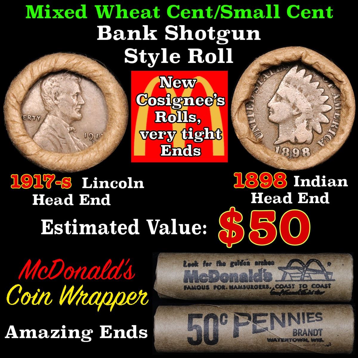 Mixed small cents 1c orig shotgun roll, 1917-s Wheat Cent, 1898 Indian Cent other end . .. The roll is held in an old Rare & Collectable McDonalds Brandt wrapper. Actual roll pictured is the roll you will get. A great original bank shotgun roll with very tight ends. We have opened a few of these rolls. They seem to be mixed small cents including Indians, Wheats, Steel cents & some Flying Eagles mixed in. These shotgun rolls are all from a new consignee. They are all frrom one Estate.