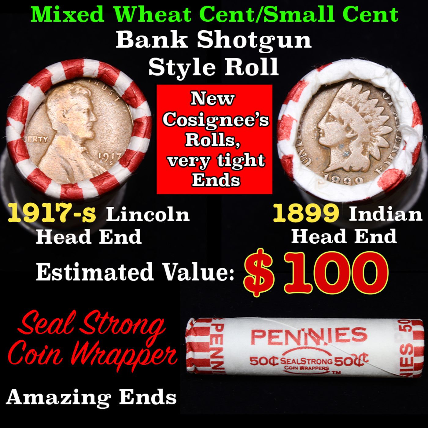 Mixed small cents 1c orig shotgun roll, 1917-s Wheat Cent, 1899 Indian Cent other end, Seal Strong Wrapper. The roll is held in an old Rare & Collectable Seal Strong Wrapper. Actual roll pictured is the roll you will get. A great original bank shotgun roll with very tight ends. We have opened a few of these rolls. They seem to be mixed small cents including Indians, Wheats, Steel cents & some Flying Eagles mixed in. These shotgun rolls are all from a new consignee. They are all frrom one Estate.