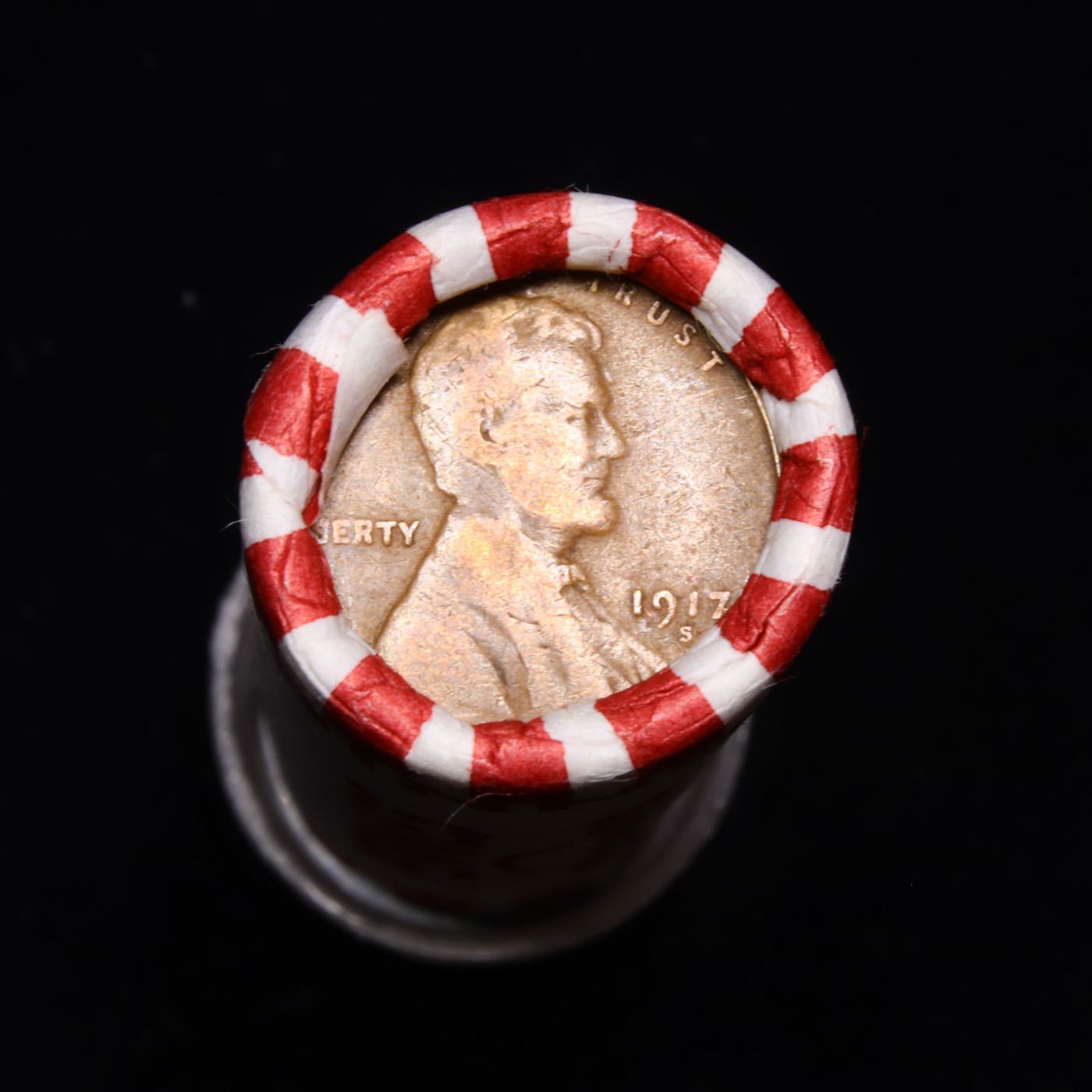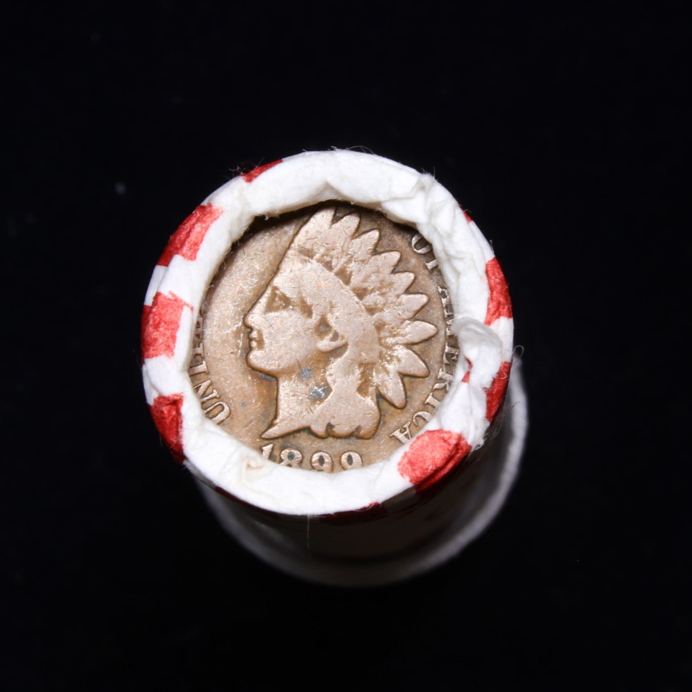 Mixed small cents 1c orig shotgun roll, 1917-s Wheat Cent, 1899 Indian Cent other end, Seal Strong W