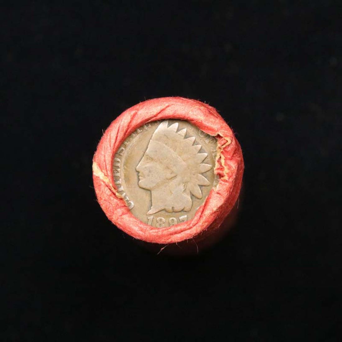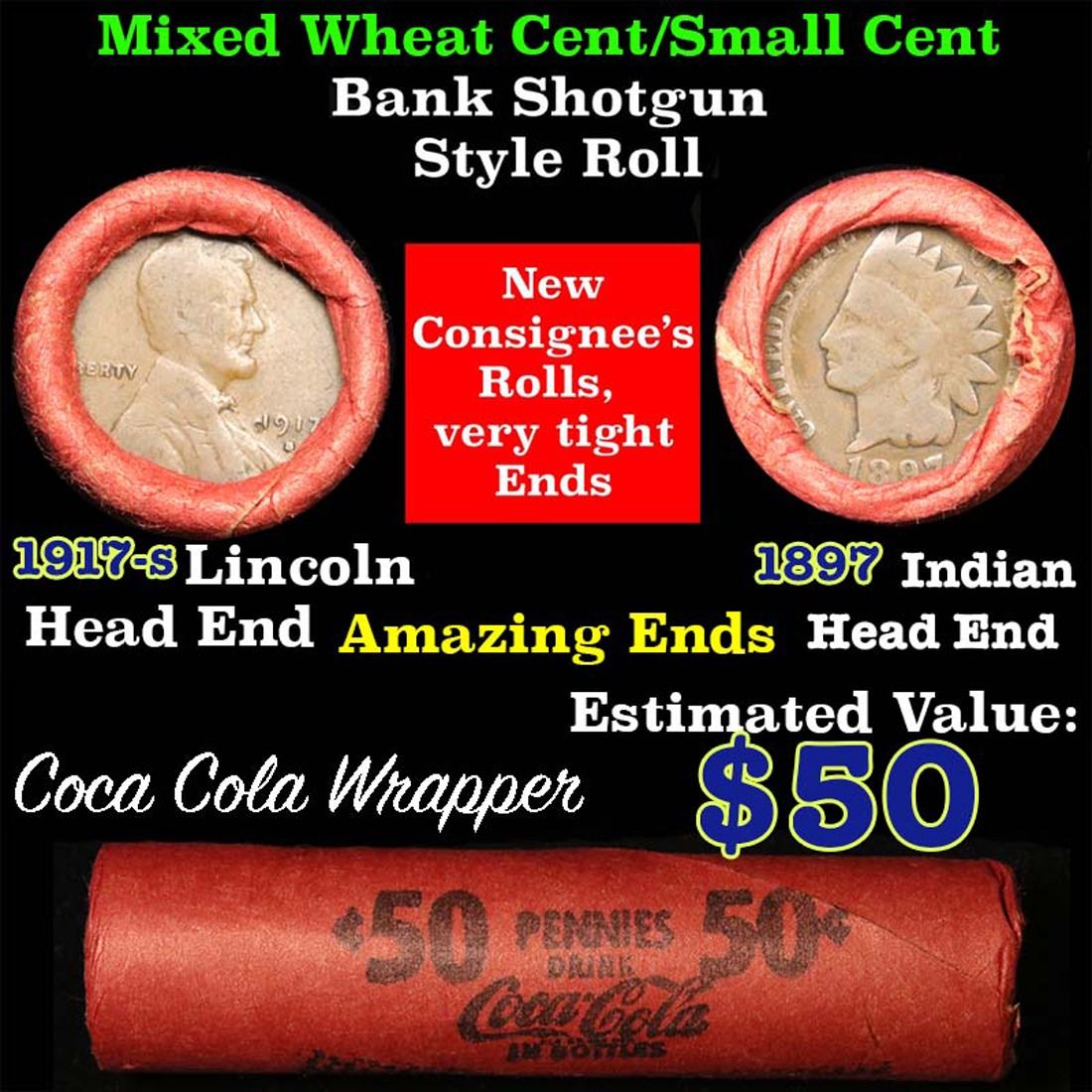 Mixed small cents 1c orig shotgun roll, 1917-s one end, 1897 Indian cent other end. The roll is held in an old, rare and collectible Coca-Cola wrapper. Actual roll pictured is the roll you will get. A great original bank shotgun roll with very tight ends. We have been getting excellent feedback on these rolls. Were being told that close to half the roll are teens, some with mintmarks, there are a few Indians in all the rolls, most of the rolls have steel cents. They seem to be PQ Wheaties rolls. These shotgun rolls are all from a new consignee. They are all frrom one Estate. This particular Roll shows a 1917-s on one end and an 1897 Indian on the other end.