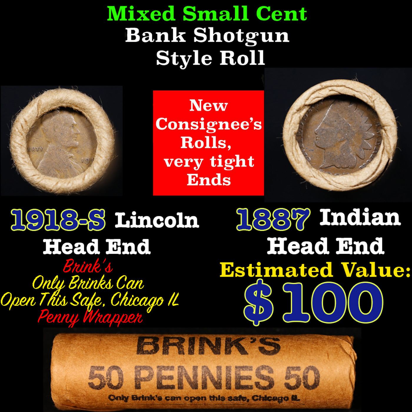 Mixed small cents 1c orig shotgun roll, 1918-S Wheat Cent, 1887 Indian Cent other end, Brinks Wrapper.. The roll is held in an old Rare & Collectable Brinks 'Only Brinks Can Open This Safe, Chicago IL' Penny wrapper. Actual roll pictured is the roll you will get. A great original bank shotgun roll with very tight ends. We have opened a few of these rolls. They seem to be mixed small cents including Indians, Wheats, Steel cents & some Flying Eagles mixed in. These shotgun rolls are all from a new consignee. They are all frrom one Estate.