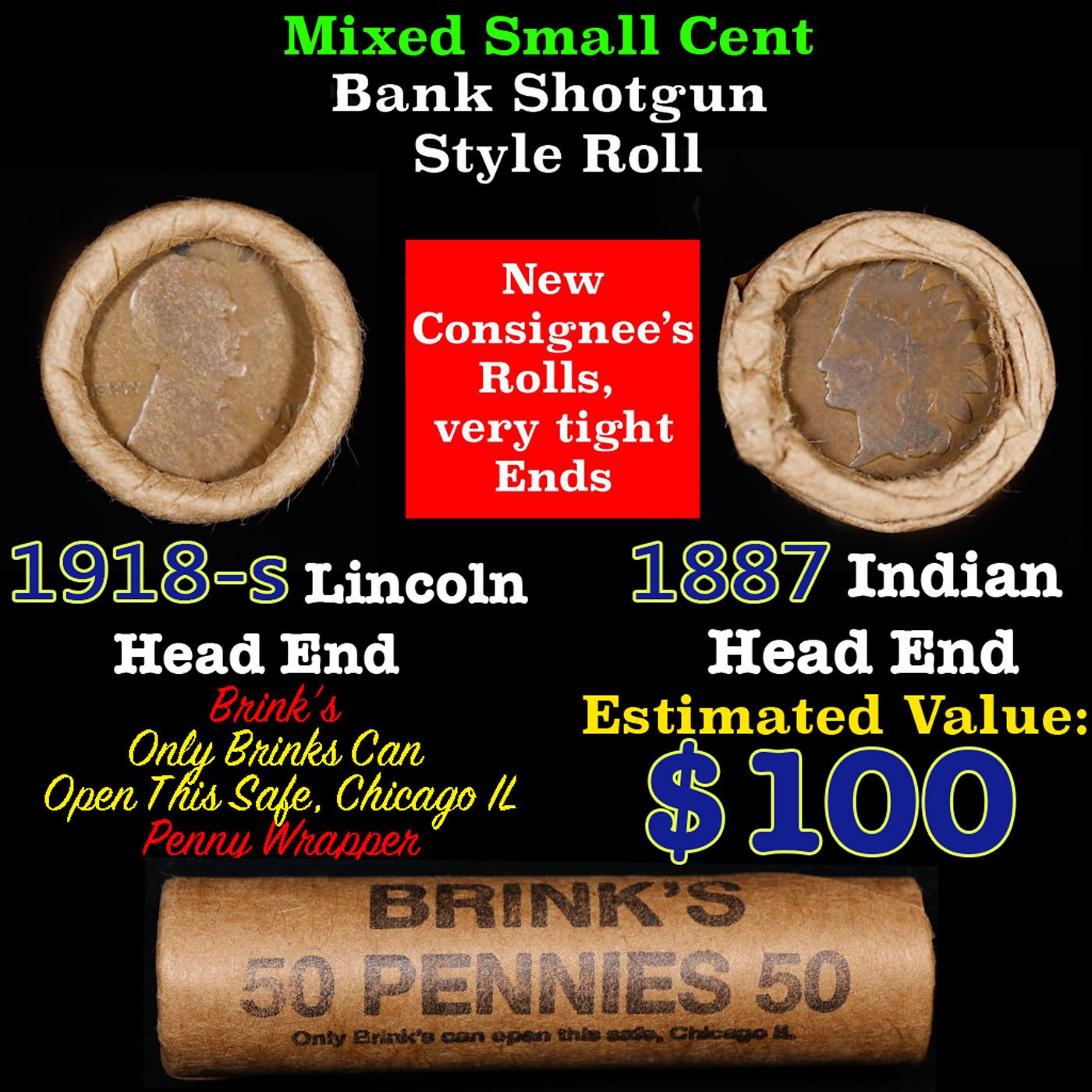 Mixed small cents 1c orig shotgun roll, 1918-S Wheat Cent, 1887 Indian Cent other end, Brinks Wrapper.. The roll is held in an old Rare & Collectable Brinks 'Only Brinks Can Open This Safe, Chicago IL' Penny wrapper. Actual roll pictured is the roll you will get. A great original bank shotgun roll with very tight ends. We have opened a few of these rolls. They seem to be mixed small cents including Indians, Wheats, Steel cents & some Flying Eagles mixed in. These shotgun rolls are all from a new consignee. They are all frrom one Estate.