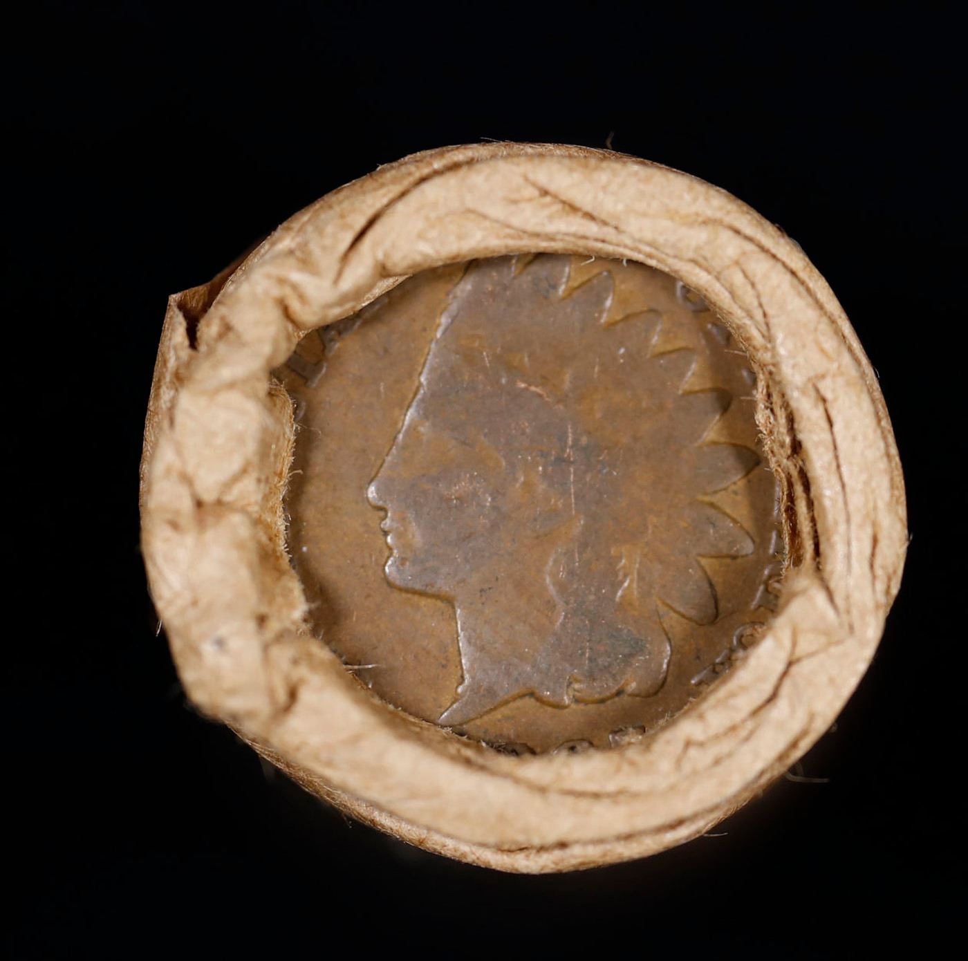 Mixed small cents 1c orig shotgun roll, 1918-S Wheat Cent, 1887 Indian Cent other end, Brinks Wrappe