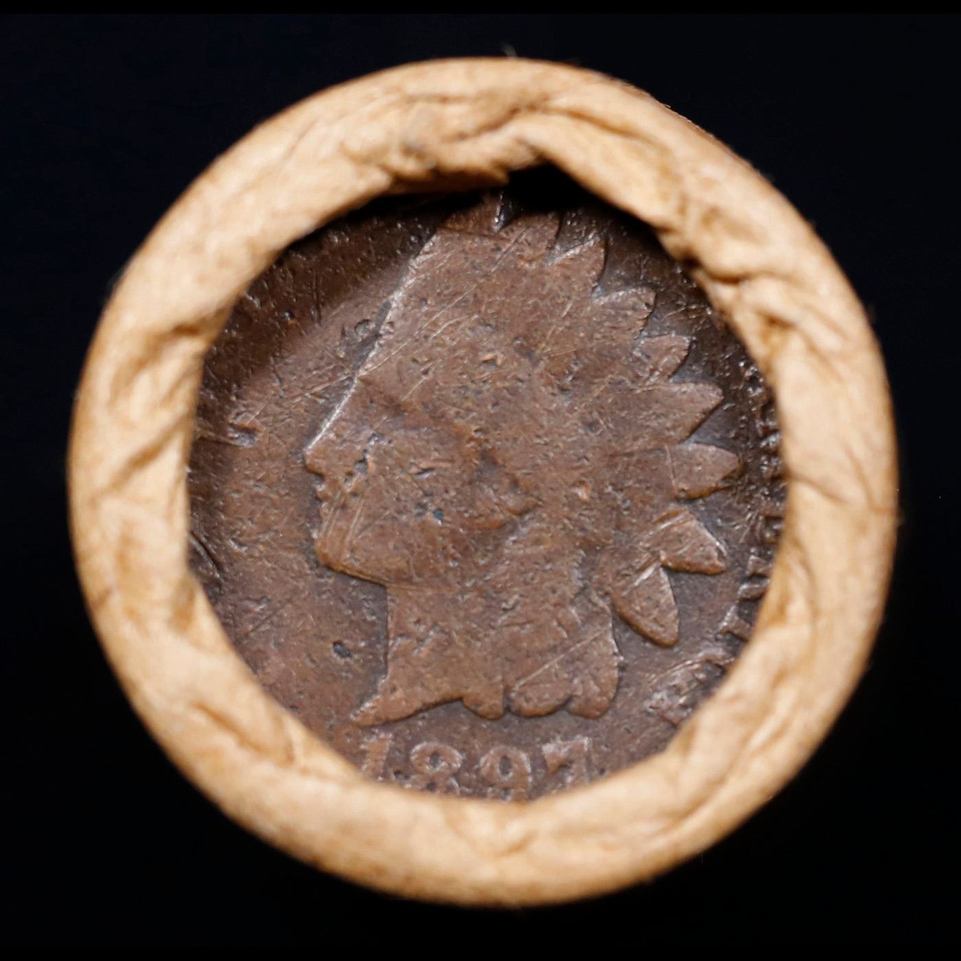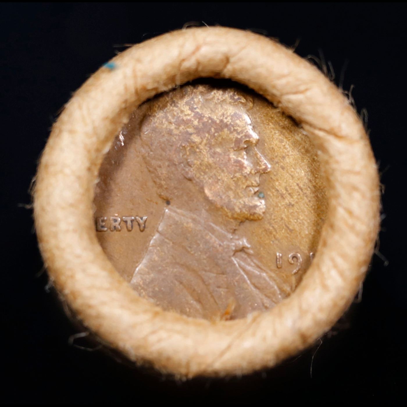 Mixed small cents 1c orig shotgun roll, 1918-S Wheat Cent, 1897 Indian Cent other end, Brinks Wrappe