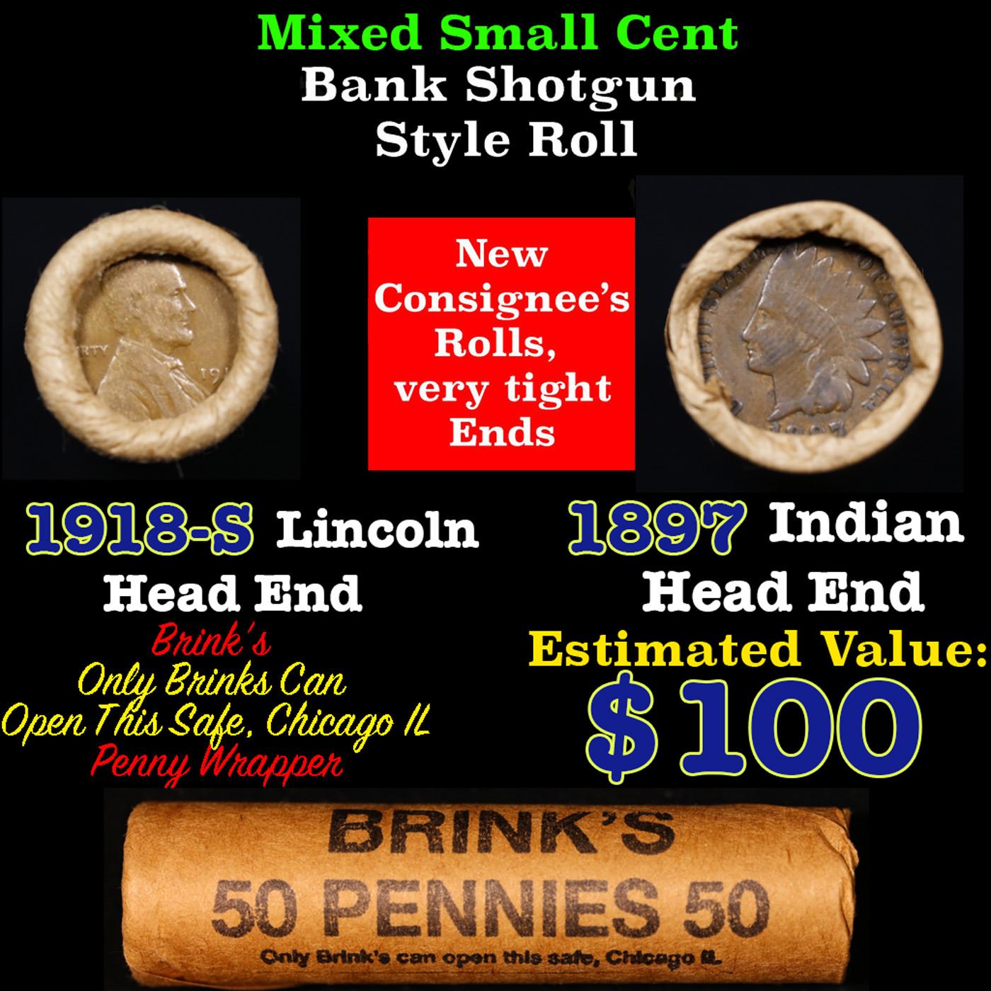 Mixed small cents 1c orig shotgun roll, 1918-S Wheat Cent, 1897 Indian Cent other end, Brinks Wrapper.. The roll is held in an old Rare & Collectable Brinks 'Only Brinks Can Open This Safe, Chicago IL' Penny wrapper. Actual roll pictured is the roll you will get. A great original bank shotgun roll with very tight ends. We have opened a few of these rolls. They seem to be mixed small cents including Indians, Wheats, Steel cents & some Flying Eagles mixed in. These shotgun rolls are all from a new consignee. They are all frrom one Estate.