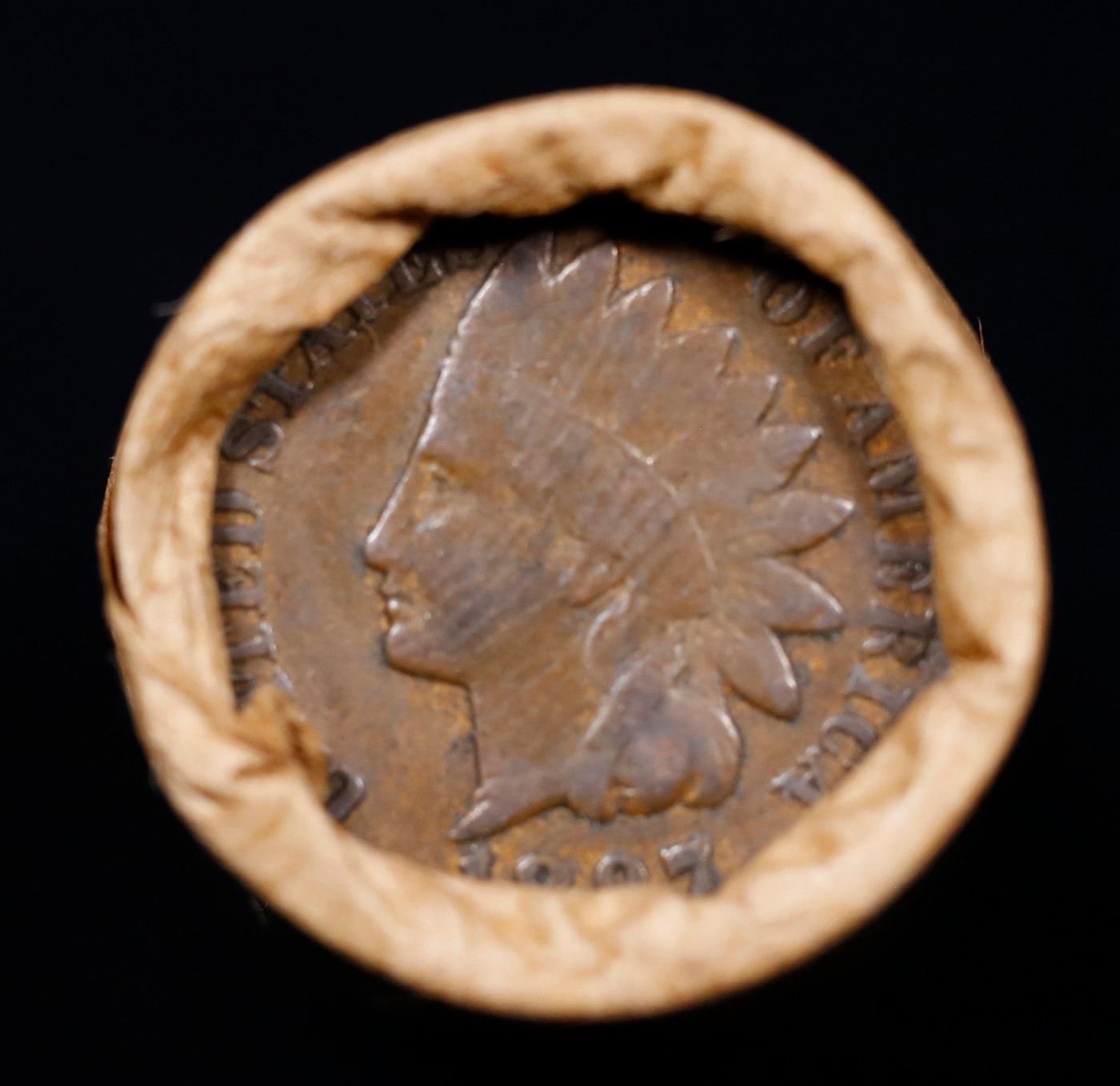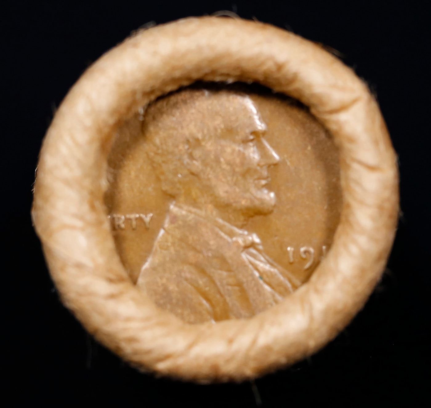Mixed small cents 1c orig shotgun roll, 1918-S Wheat Cent, 1897 Indian Cent other end, Brinks Wrappe