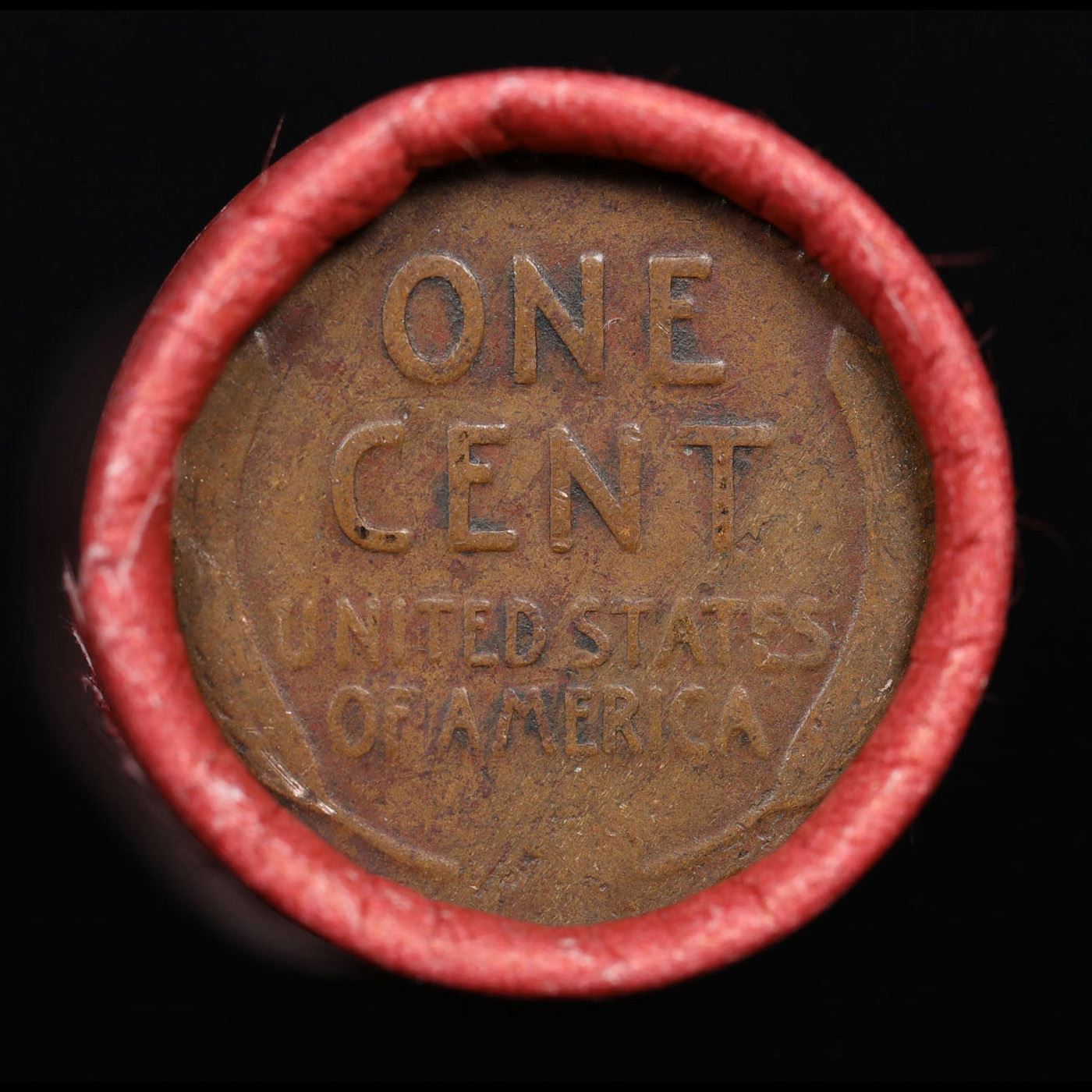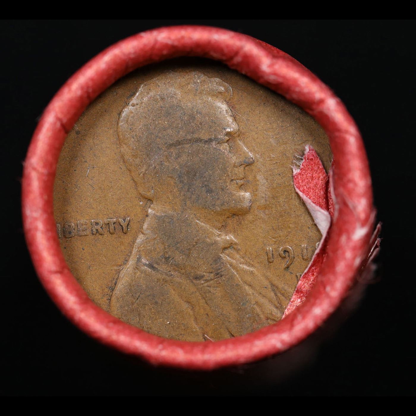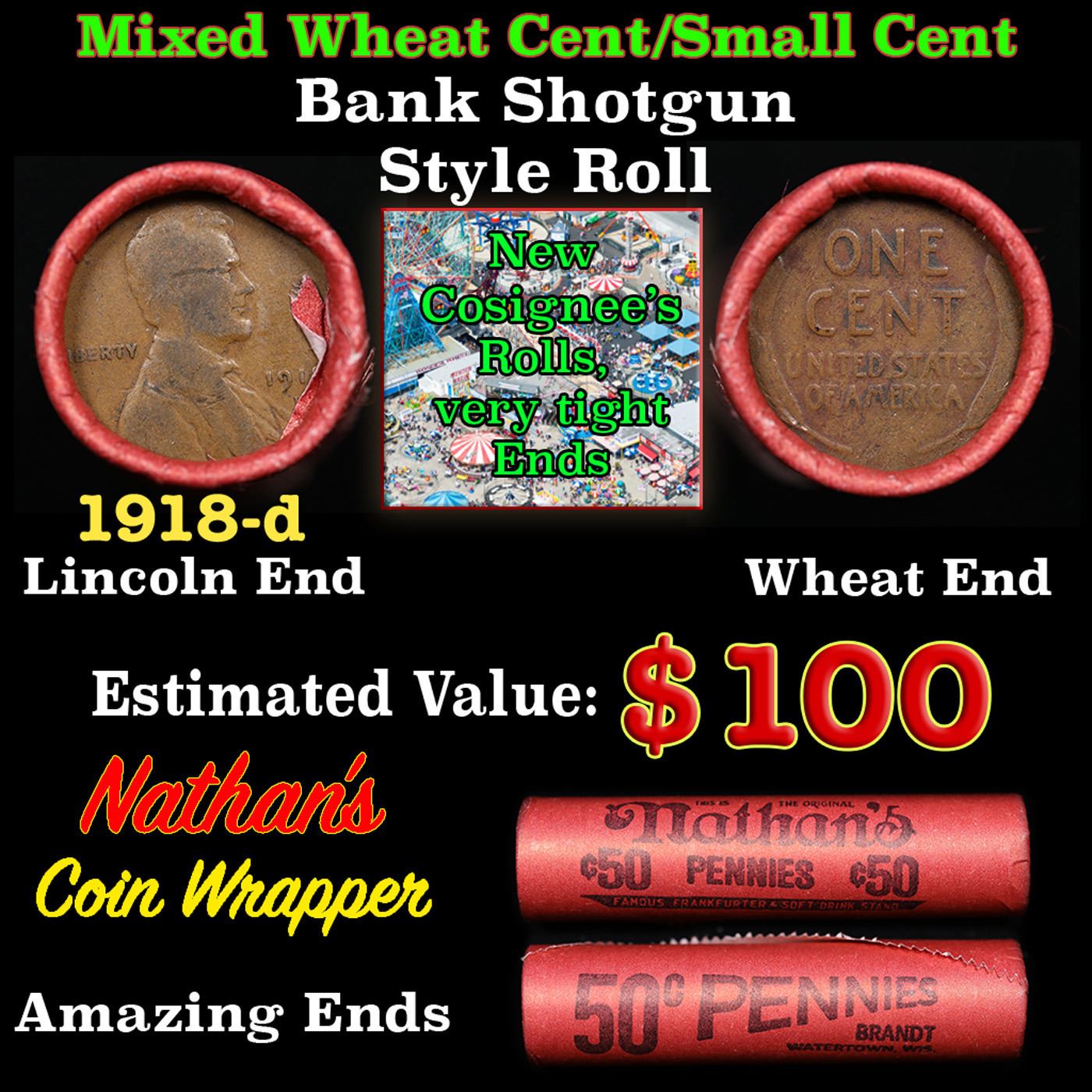 Mixed small cents 1c orig shotgun roll, 1918-d Lincoln Cent, Wheat Cent other end, Nathan's Brandt W