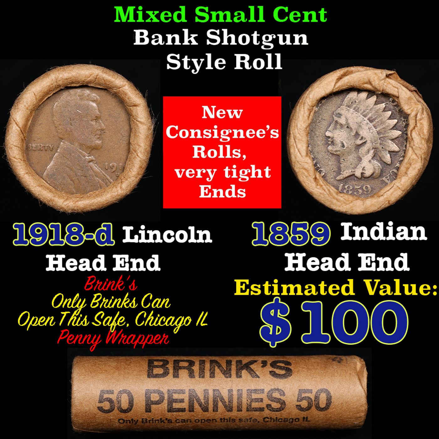 Mixed small cents 1c orig shotgun roll, 1918-d Wheat Cent, 1853 Indian Cent other end, Brinks Wrapper.. The roll is held in an old Rare & Collectable Brinks 'Only Brinks Can Open This Safe, Chicago IL' Penny wrapper. Actual roll pictured is the roll you will get. A great original bank shotgun roll with very tight ends. We have opened a few of these rolls. They seem to be mixed small cents including Indians, Wheats, Steel cents & some Flying Eagles mixed in. These shotgun rolls are all from a new consignee. They are all frrom one Estate.
