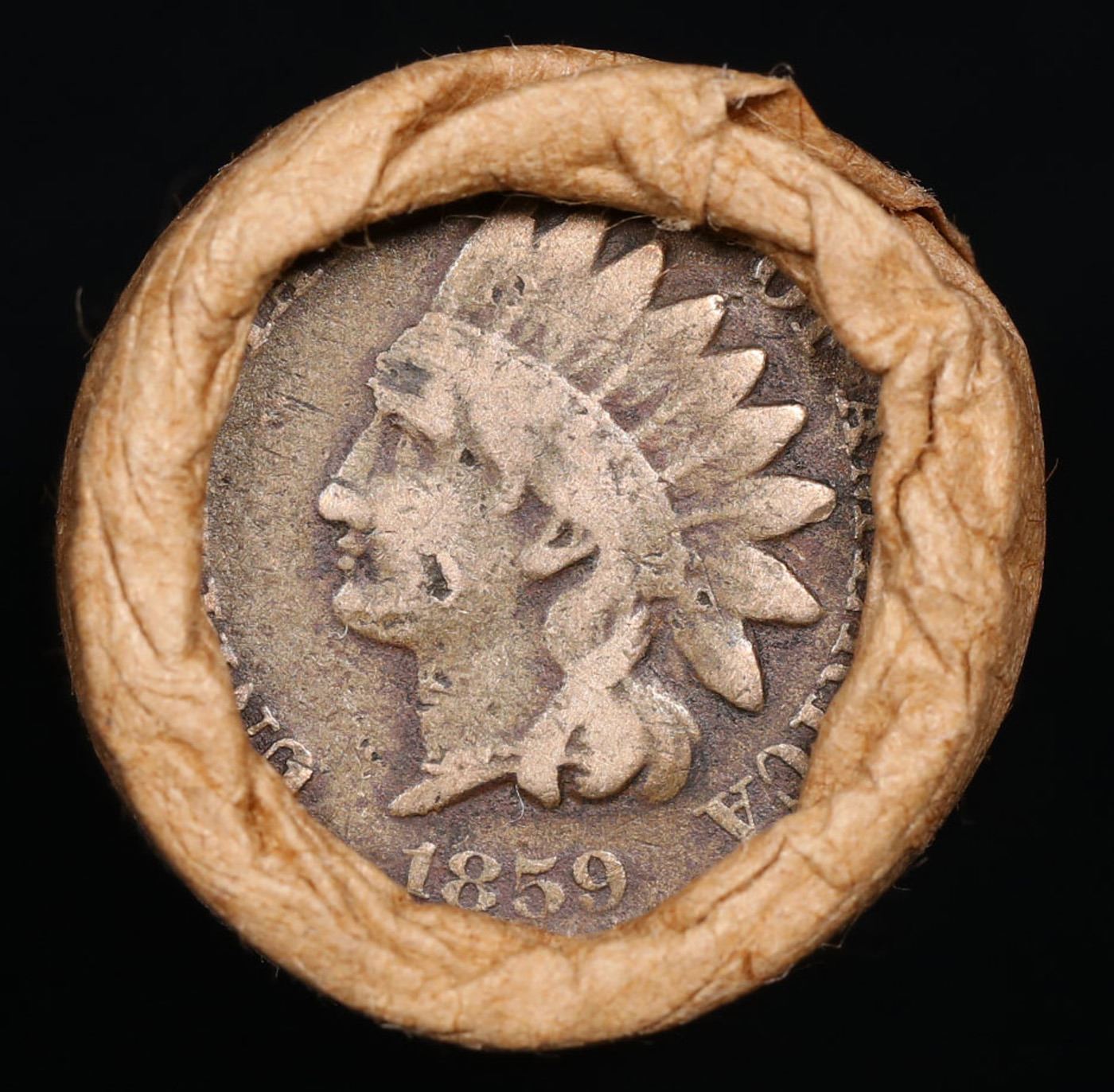 Mixed small cents 1c orig shotgun roll, 1918-d Wheat Cent, 1853 Indian Cent other end, Brinks Wrappe