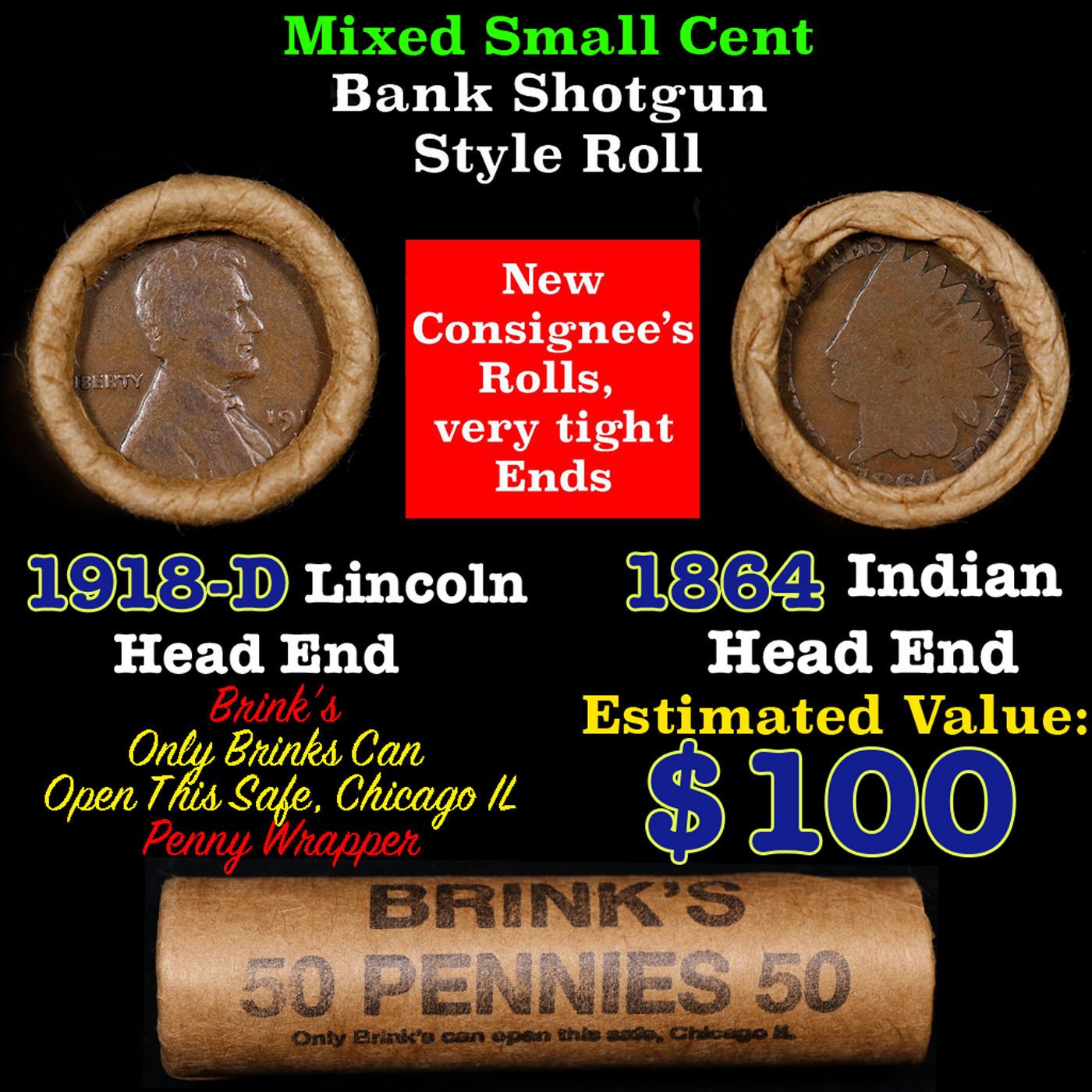 Mixed small cents 1c orig shotgun roll, 1918-d Wheat Cent, 1864 Indian Cent other end, Brinks Wrapper. The roll is held in an old Rare & Collectable Brinks Wrapper. Actual roll pictured is the roll you will get. A great original bank shotgun roll with very tight ends. We have opened a few of these rolls. They seem to be mixed small cents including Indians, Wheats, Steel cents & some Flying Eagles mixed in. These shotgun rolls are all from a new consignee. They are all frrom one Estate.