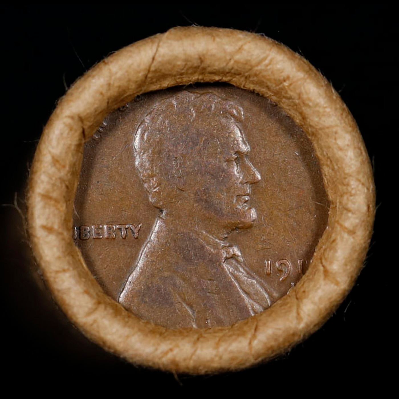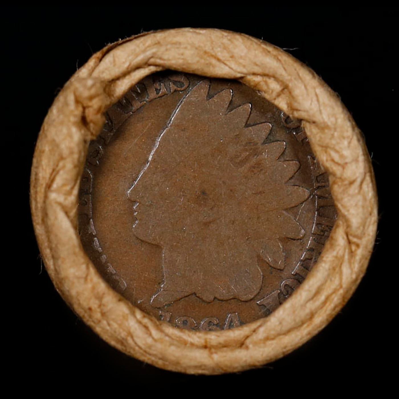 Mixed small cents 1c orig shotgun roll, 1918-d Wheat Cent, 1864 Indian Cent other end, Brinks Wrappe