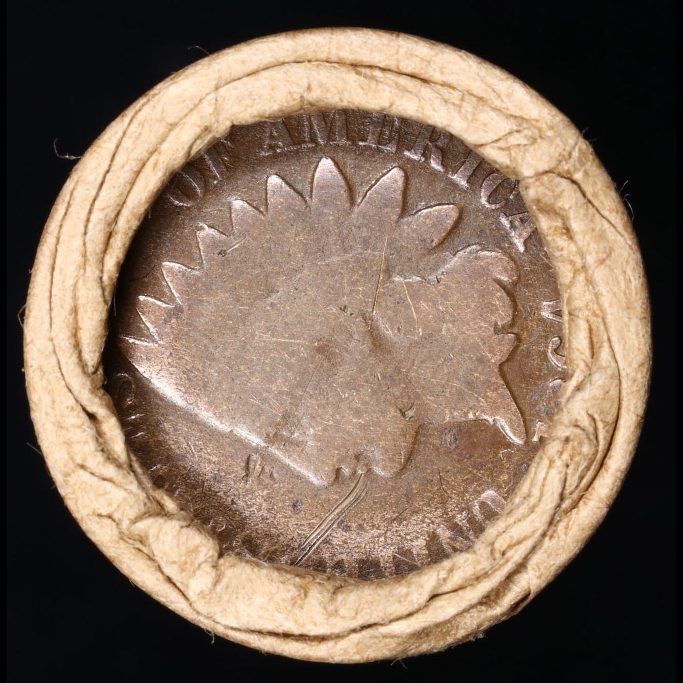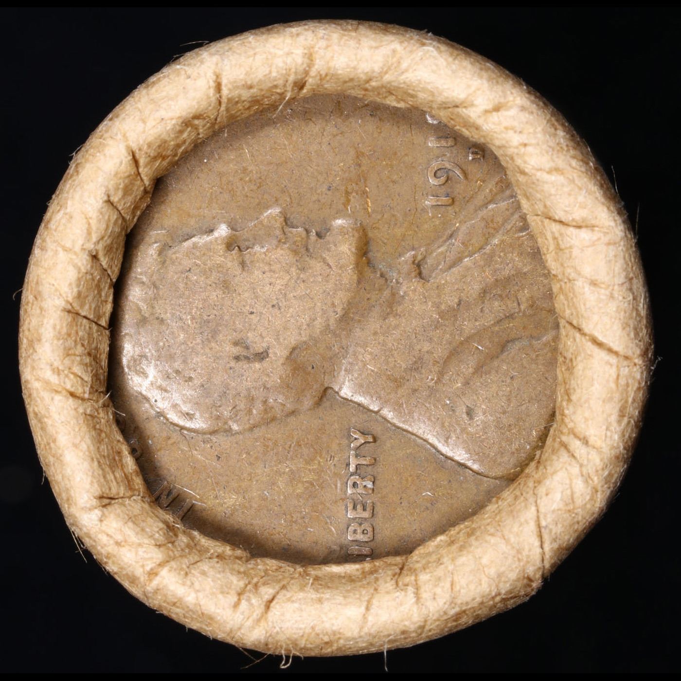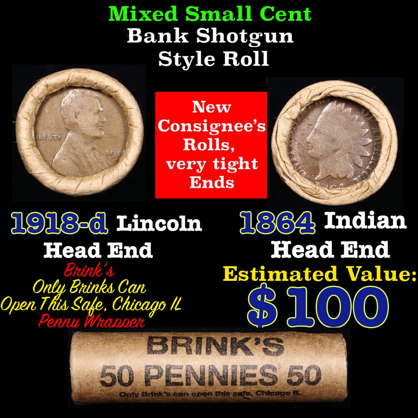 Mixed small cents 1c orig shotgun roll, 1918-d Wheat Cent, 1864 Indian Cent other end, brinks Wrappe