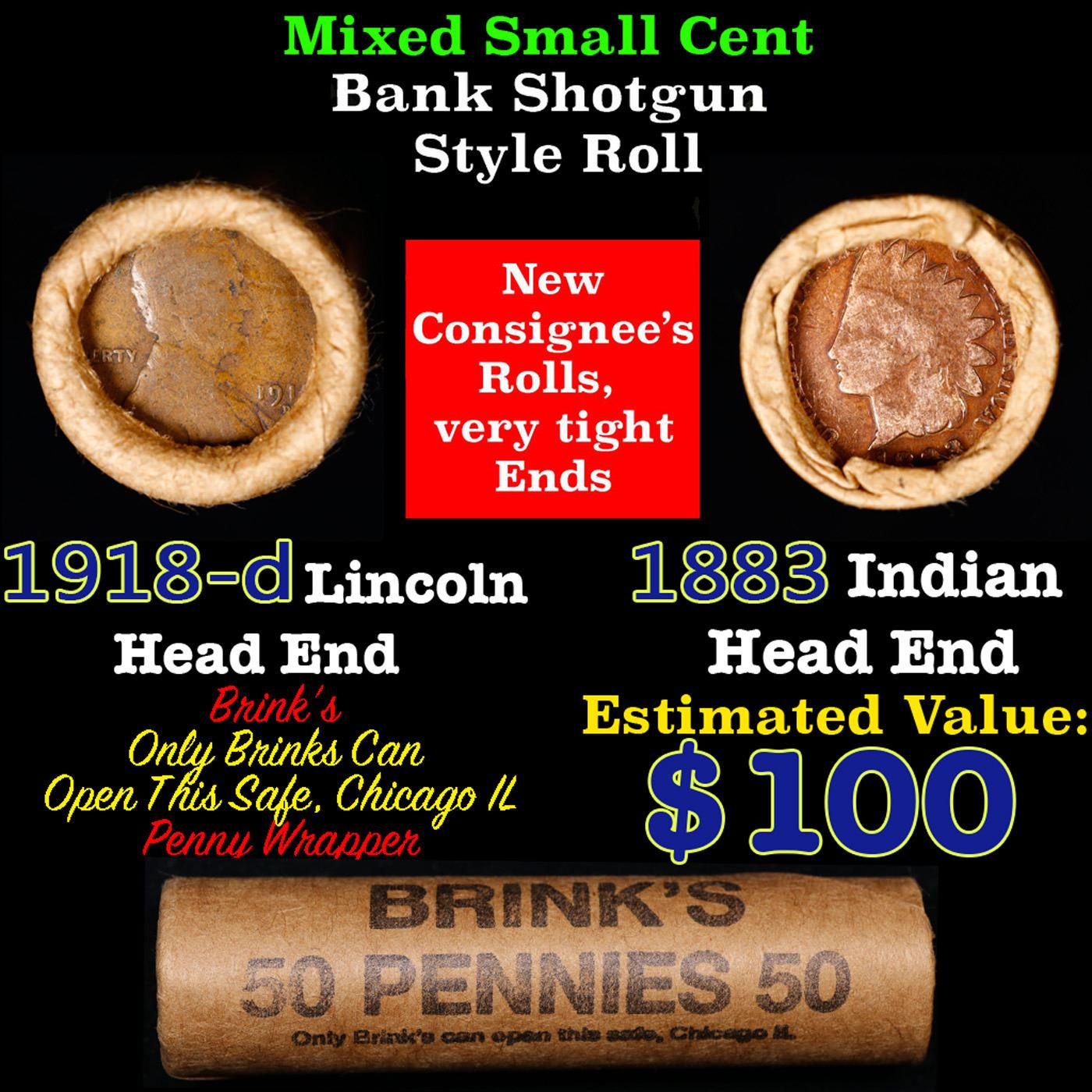 Mixed small cents 1c orig shotgun roll, 1918-d Wheat Cent, 1883 Indian Cent other end, Brinks Wrapper.. The roll is held in an old Rare & Collectable Brinks 'Only Brinks Can Open This Safe, Chicago IL' Penny wrapper. Actual roll pictured is the roll you will get. A great original bank shotgun roll with very tight ends. We have opened a few of these rolls. They seem to be mixed small cents including Indians, Wheats, Steel cents & some Flying Eagles mixed in. These shotgun rolls are all from a new consignee. They are all frrom one Estate.