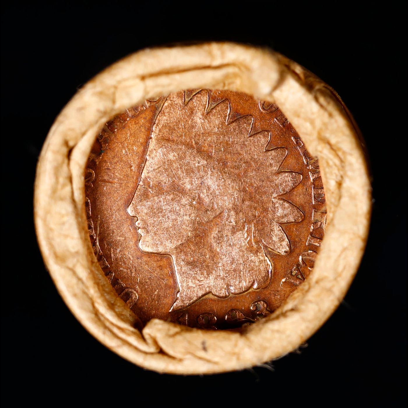 Mixed small cents 1c orig shotgun roll, 1918-d Wheat Cent, 1883 Indian Cent other end, Brinks Wrappe