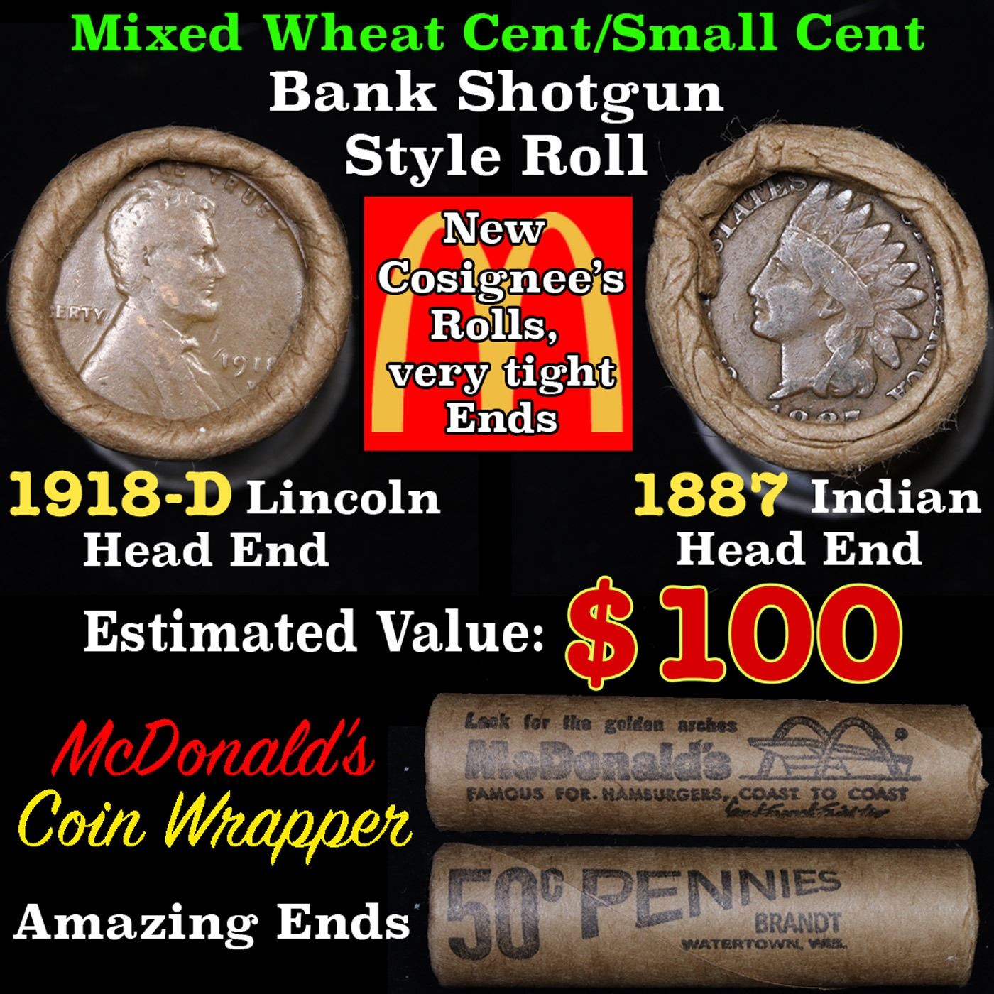 Mixed small cents 1c orig shotgun roll, 1918-d Wheat Cent, 1887 Indian Cent other end,McDnalds Wrapper Grades. The roll is held in an old Rare & Collectable McDonalds Brandt wrapper. Look For The Golden Arches. Actual roll pictured is the roll you will get. A great original bank shotgun roll with very tight ends. We have opened a few of these rolls. They seem to be mixed small cents including Indians, Wheats, Steel cents & some Flying Eagles mixed in. These shotgun rolls are all from a new consignee. They are all frrom one Estate.