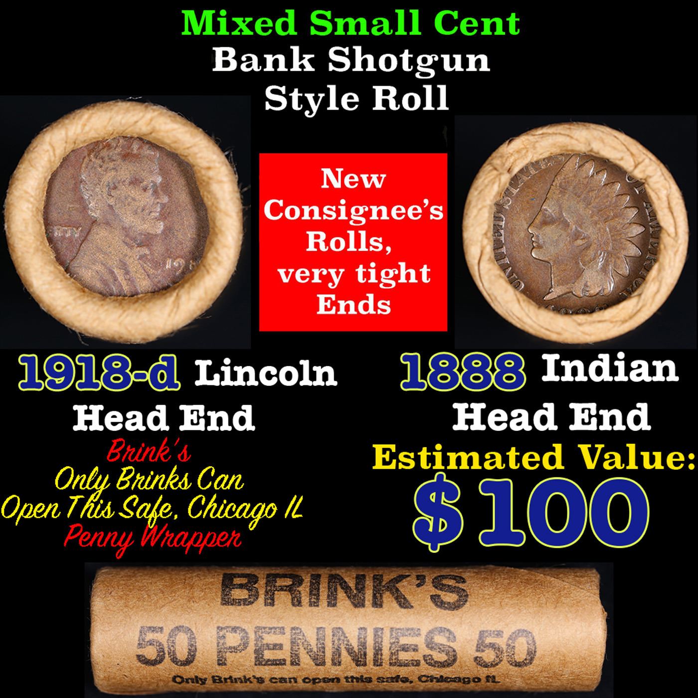 Mixed small cents 1c orig shotgun roll, 1918-d Wheat Cent, 1888 Indian Cent other end, Brinks Wrapper. The roll is held in an old Rare & Collectable Brinks Wrapper. Actual roll pictured is the roll you will get. A great original bank shotgun roll with very tight ends. We have opened a few of these rolls. They seem to be mixed small cents including Indians, Wheats, Steel cents & some Flying Eagles mixed in. These shotgun rolls are all from a new consignee. They are all frrom one Estate.