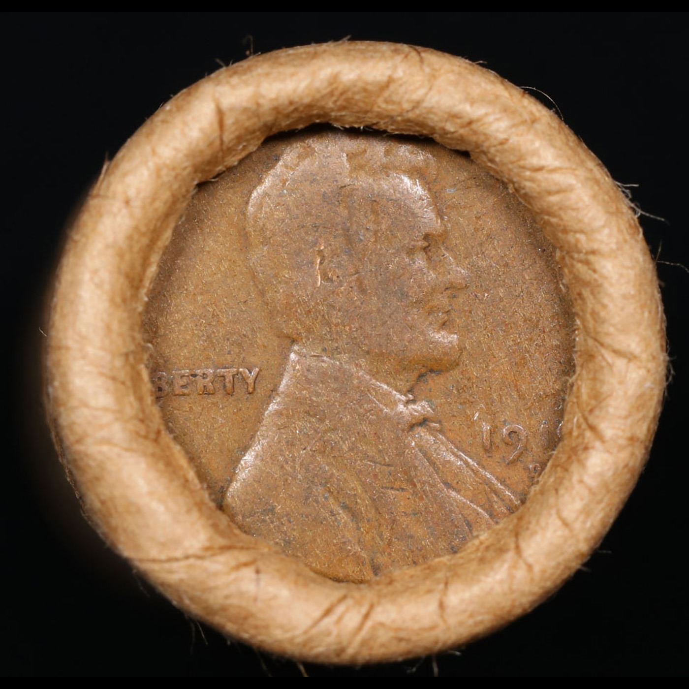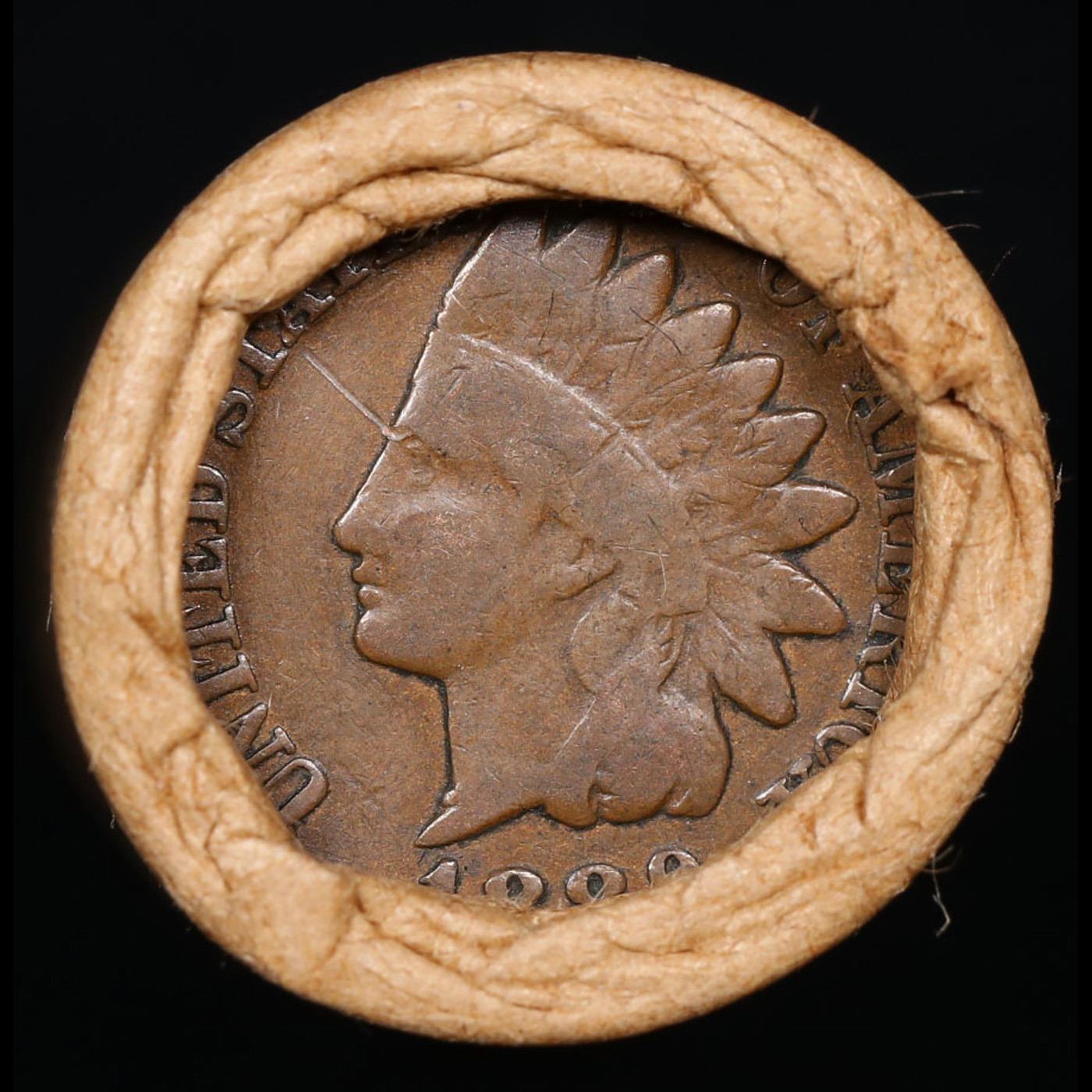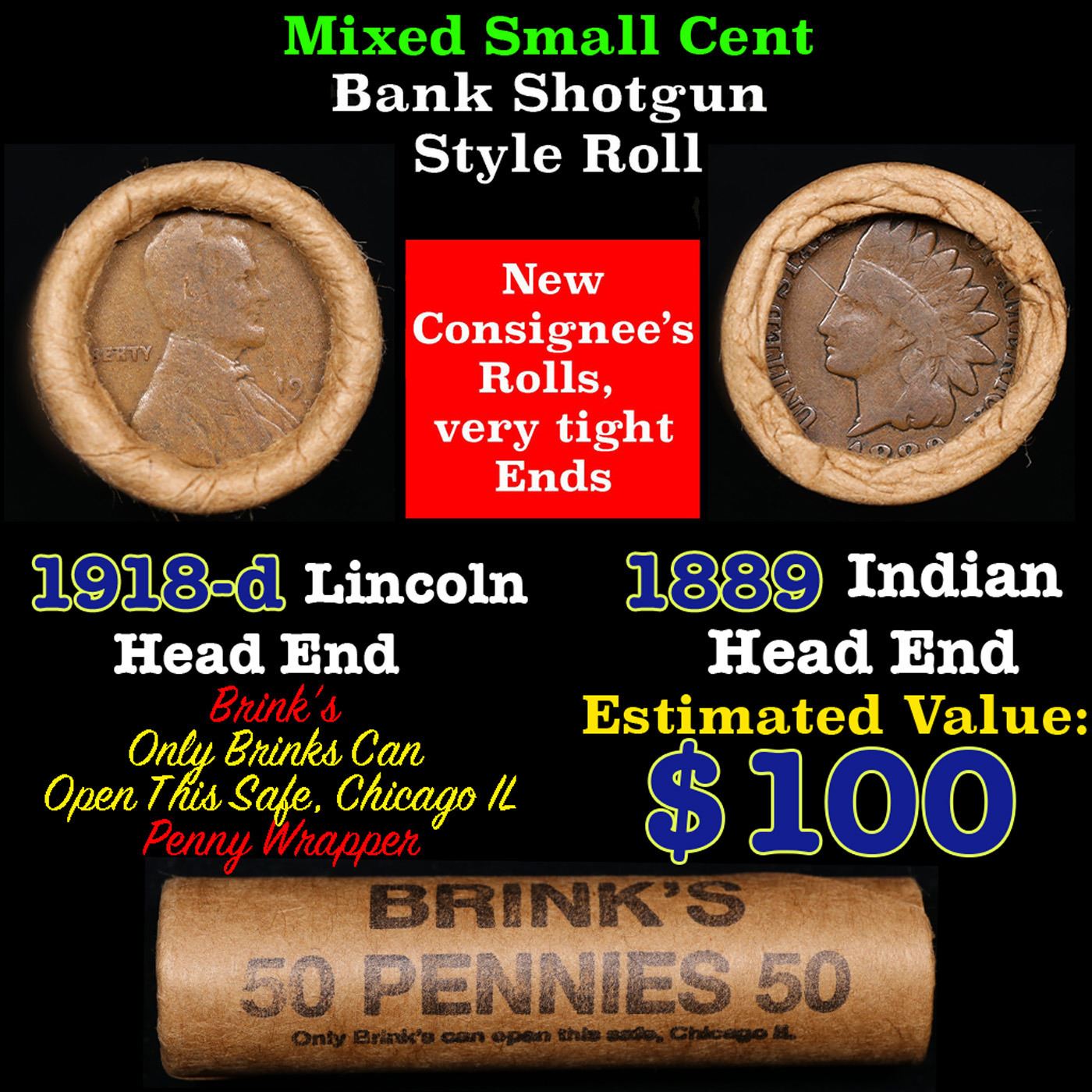 Mixed small cents 1c orig shotgun roll, 1918-d Wheat Cent, 1889 Indian Cent other end, Brinks Wrappe
