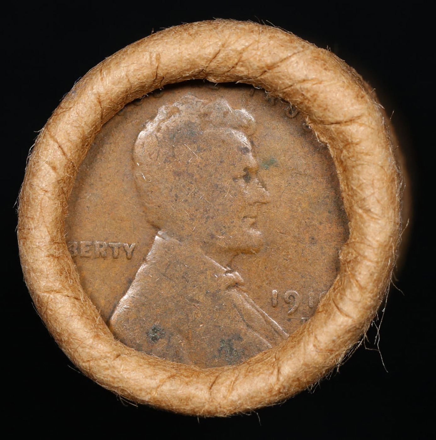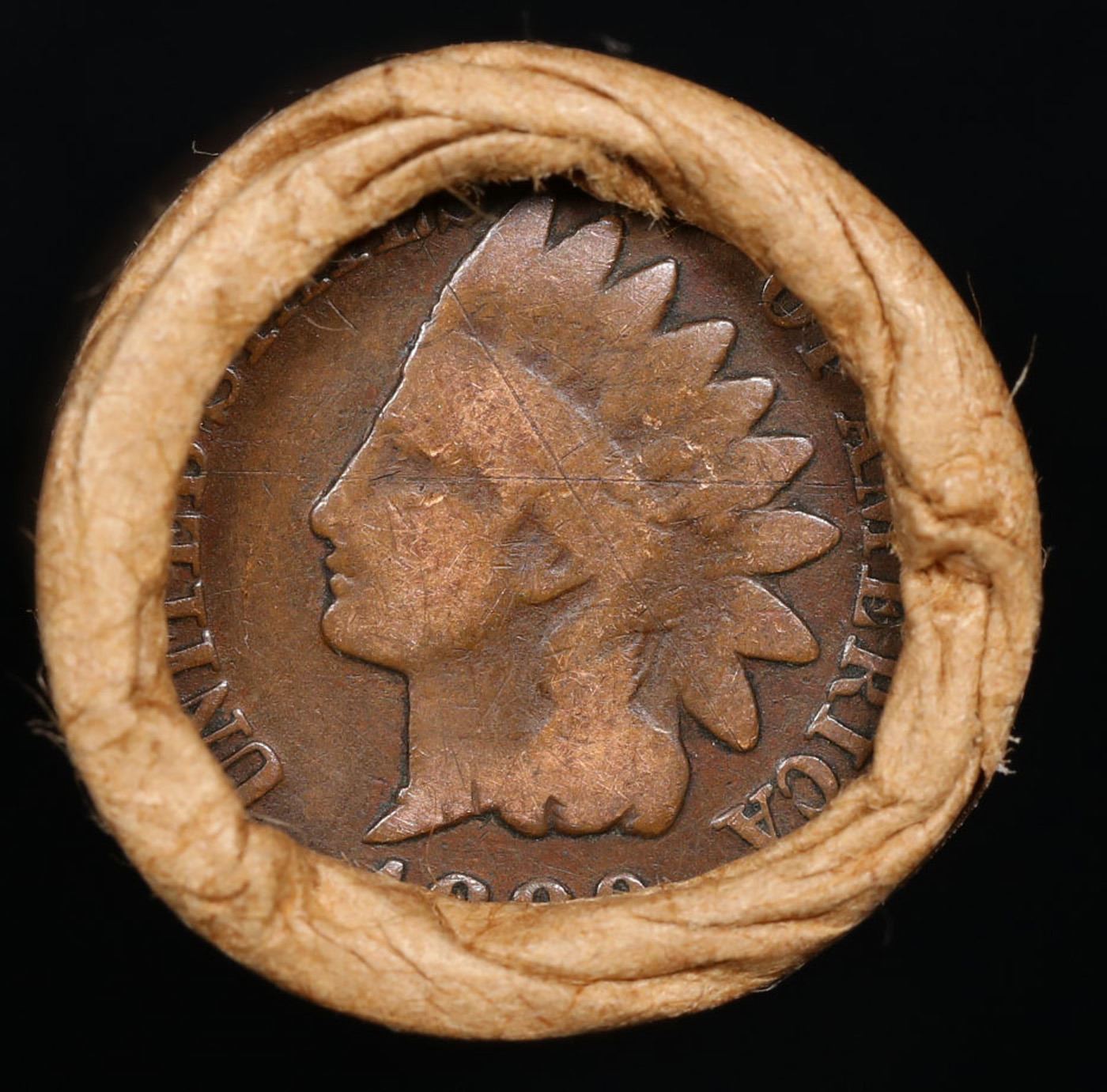 Mixed small cents 1c orig shotgun roll, 1918-d Wheat Cent, 1889 Indian Cent other end, Brinks Wrappe