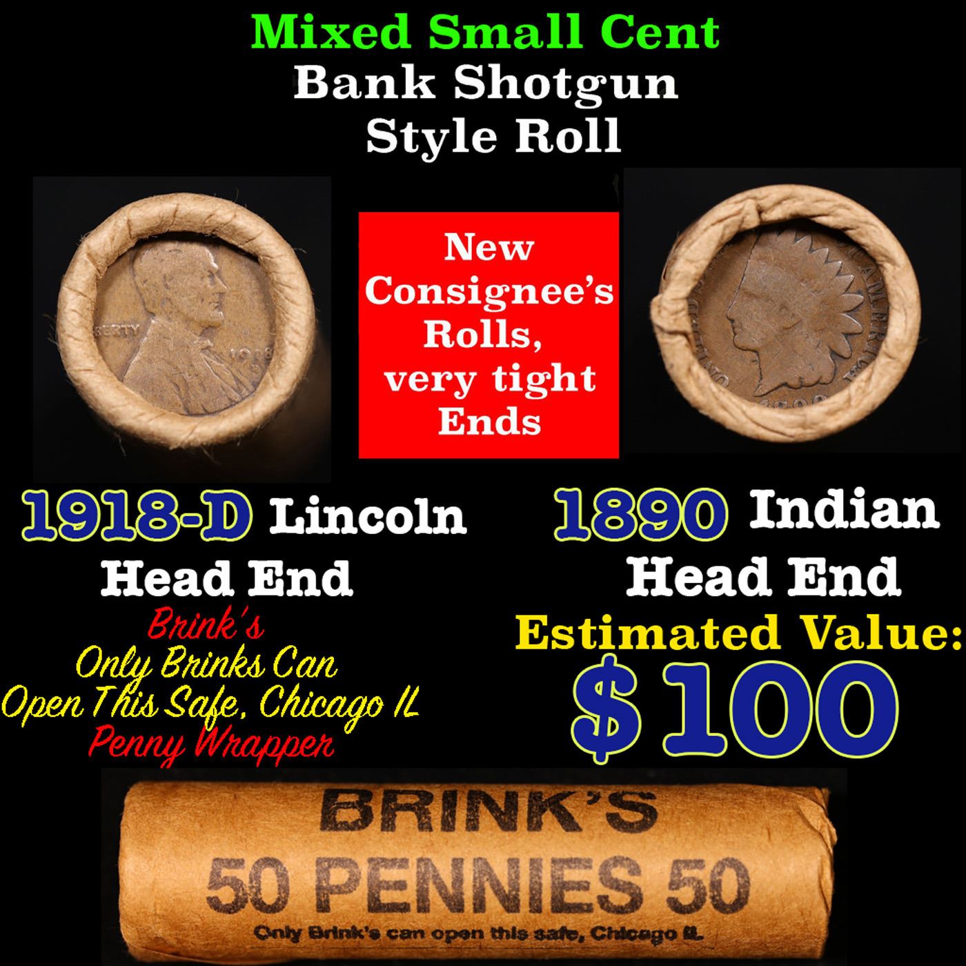 Mixed small cents 1c orig shotgun roll, 1918-d Wheat Cent, 1890 Indian Cent other end, Brinks Wrapper.. The roll is held in an old Rare & Collectable Brinks 'Only Brinks Can Open This Safe, Chicago IL' Penny wrapper. Actual roll pictured is the roll you will get. A great original bank shotgun roll with very tight ends. We have opened a few of these rolls. They seem to be mixed small cents including Indians, Wheats, Steel cents & some Flying Eagles mixed in. These shotgun rolls are all from a new consignee. They are all frrom one Estate.