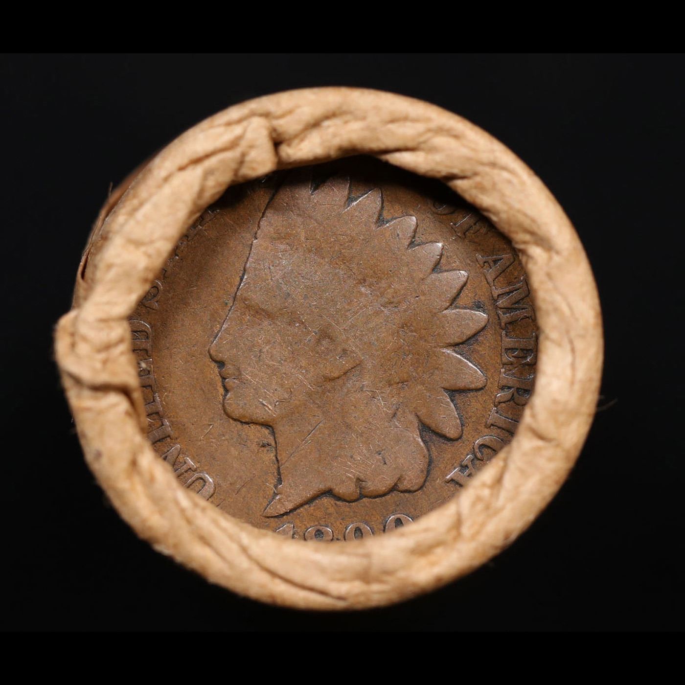 Mixed small cents 1c orig shotgun roll, 1918-d Wheat Cent, 1890 Indian Cent other end, Brinks Wrappe