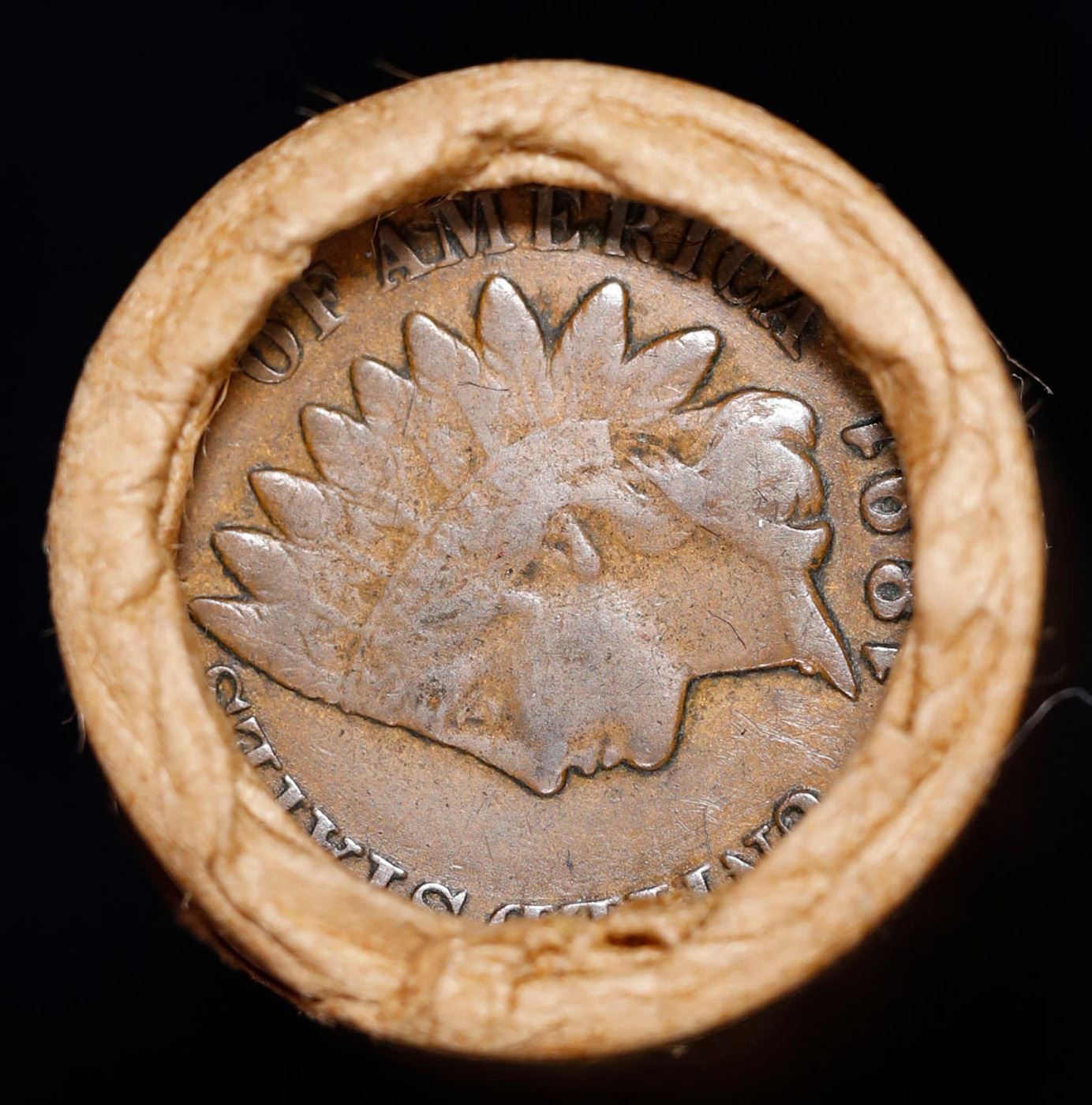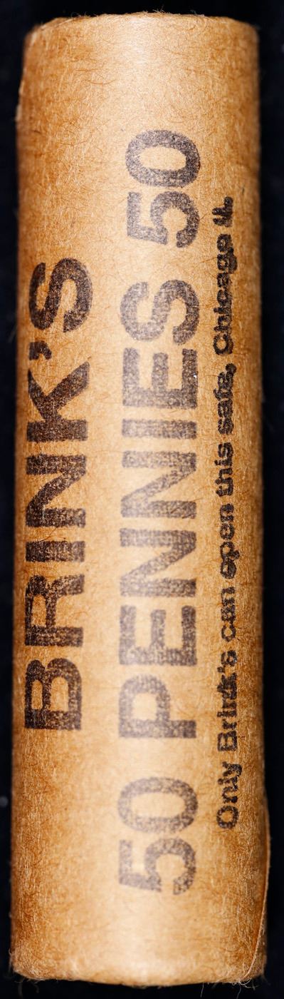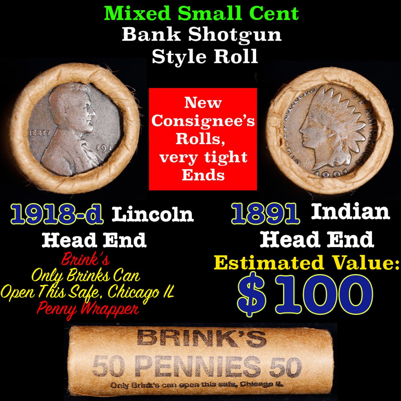 Mixed small cents 1c orig shotgun roll, 1918-d Wheat Cent, 1891 Indian Cent other end, Brinks Wrappe